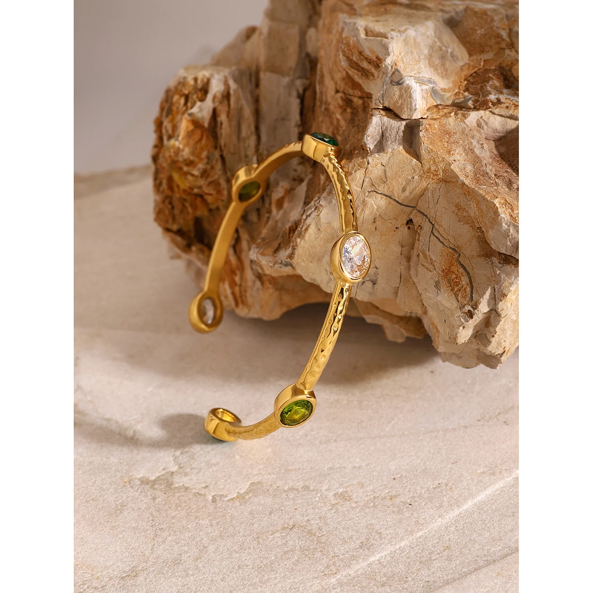 Imagine elevating your everyday look with this exquisite gold stainless steel bracelet. Its sleek, open cuff design offers a modern touch, perfect for any occasion. The PVD gold finish ensures a luminous, long-lasting shine that resists fading and scratches, maintaining its luxurious appearance over time. The vibrant green zircon centerpiece and subtle green accents provide a pop of color, adding an elegant yet trendy vibe. Lightweight at only 15 grams, this bracelet feels comfortable and adjustable to fit various wrist sizes. Its waterproof and hypoallergenic qualities make it perfect for daily wear, seamlessly blending fashion with durability. Make this versatile accessory yours and enjoy its captivating style daily.