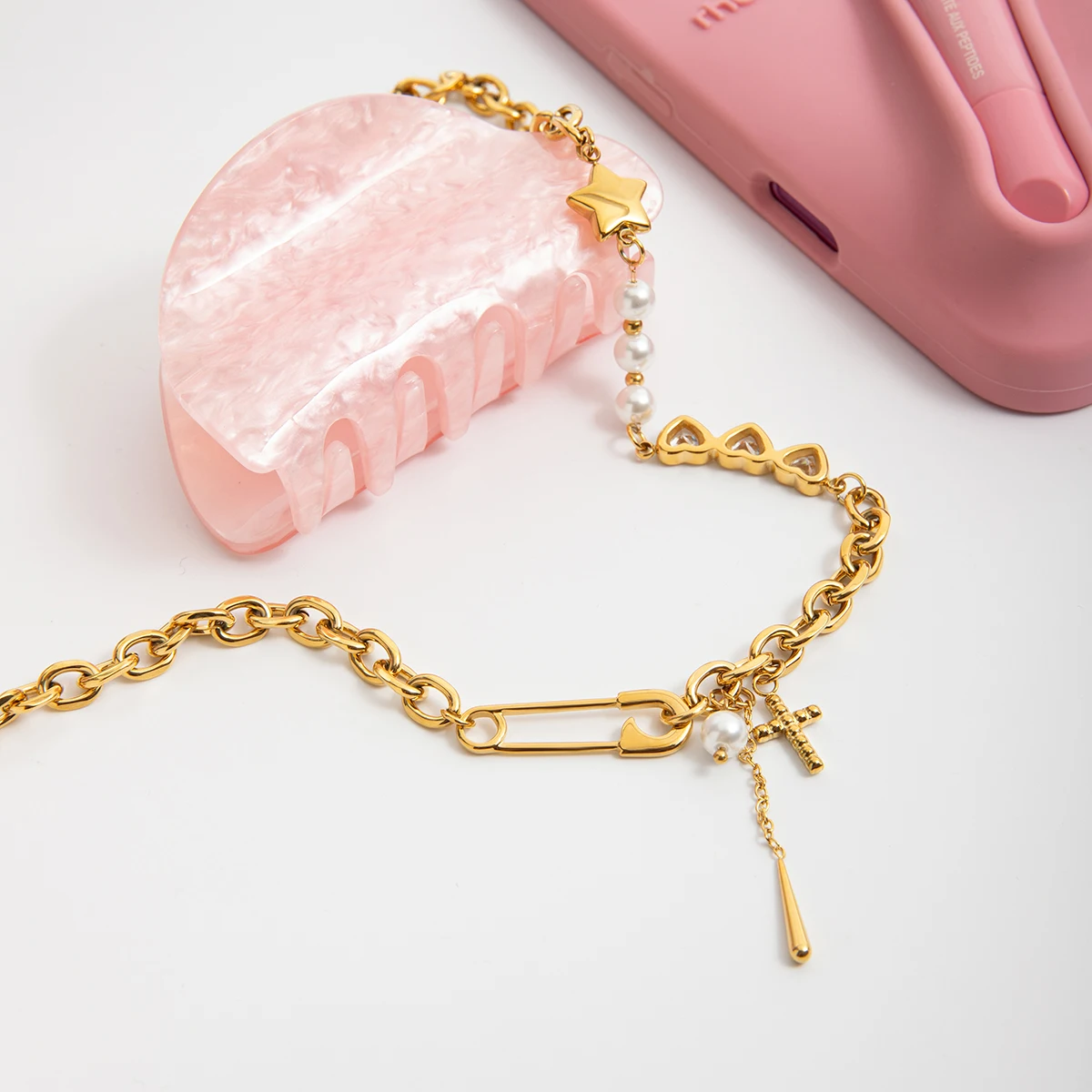 Imagine elevating your look with this exquisite layered necklace that perfectly blends elegance and modern style. Crafted from durable stainless steel in a luminous gold tone, it features a delicate top layer of tiny, white pearls that add a timeless charm. The bold lower layer showcases a chunky chain with large, oval links, creating a striking contrast. Attached are three open-heart charms enameled with sparkling clear rhinestones arranged in a row, adding playful sophistication. A small, gold-shaped cross pendant hangs from the chain, providing subtle metallic allure. Its geometric design makes it a versatile accessory for any occasion, effortlessly transitioning from casual to party wear. Experience everyday elegance with this sophisticated piece—ideal for anyone seeking a refined yet trendy look.