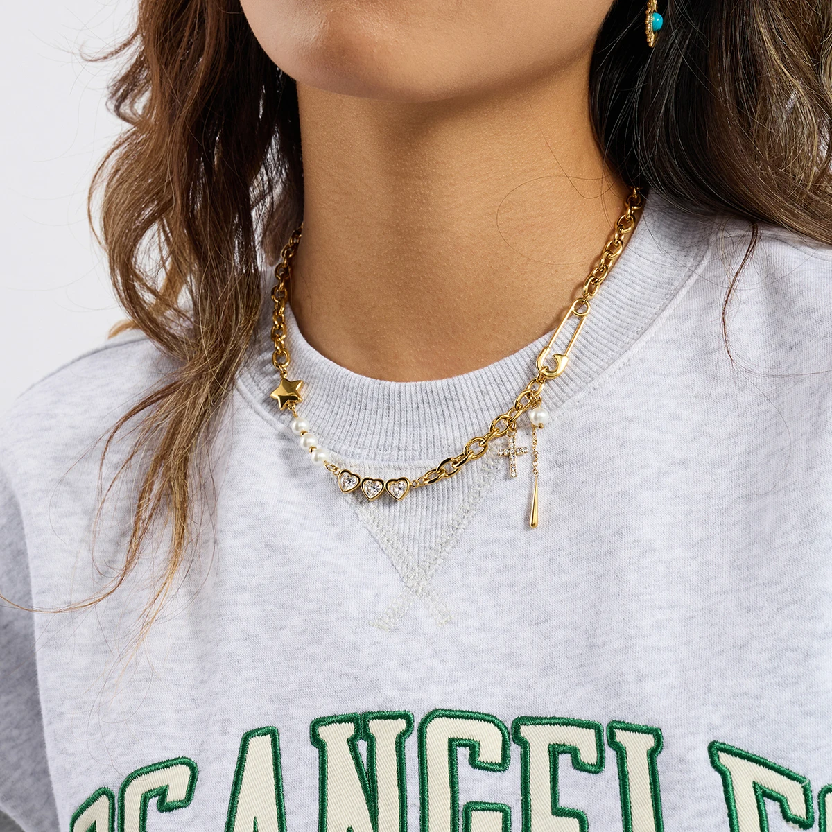 Enhance your accessory collection with this versatile and chic necklace. Its timeless design, combining sparkling rhinestones with metallic finishes, makes it a perfect gift for yourself or someone special. Whether for casual outings or special celebrations, this necklace adds a touch of sophistication and playful charm. Its durable stainless steel construction ensures long-lasting wear, while the classic gold tone complements any wardrobe. Elevate your style effortlessly and enjoy the blend of elegance and modern fashion with this beautifully crafted piece—an essential addition to your jewelry collection.