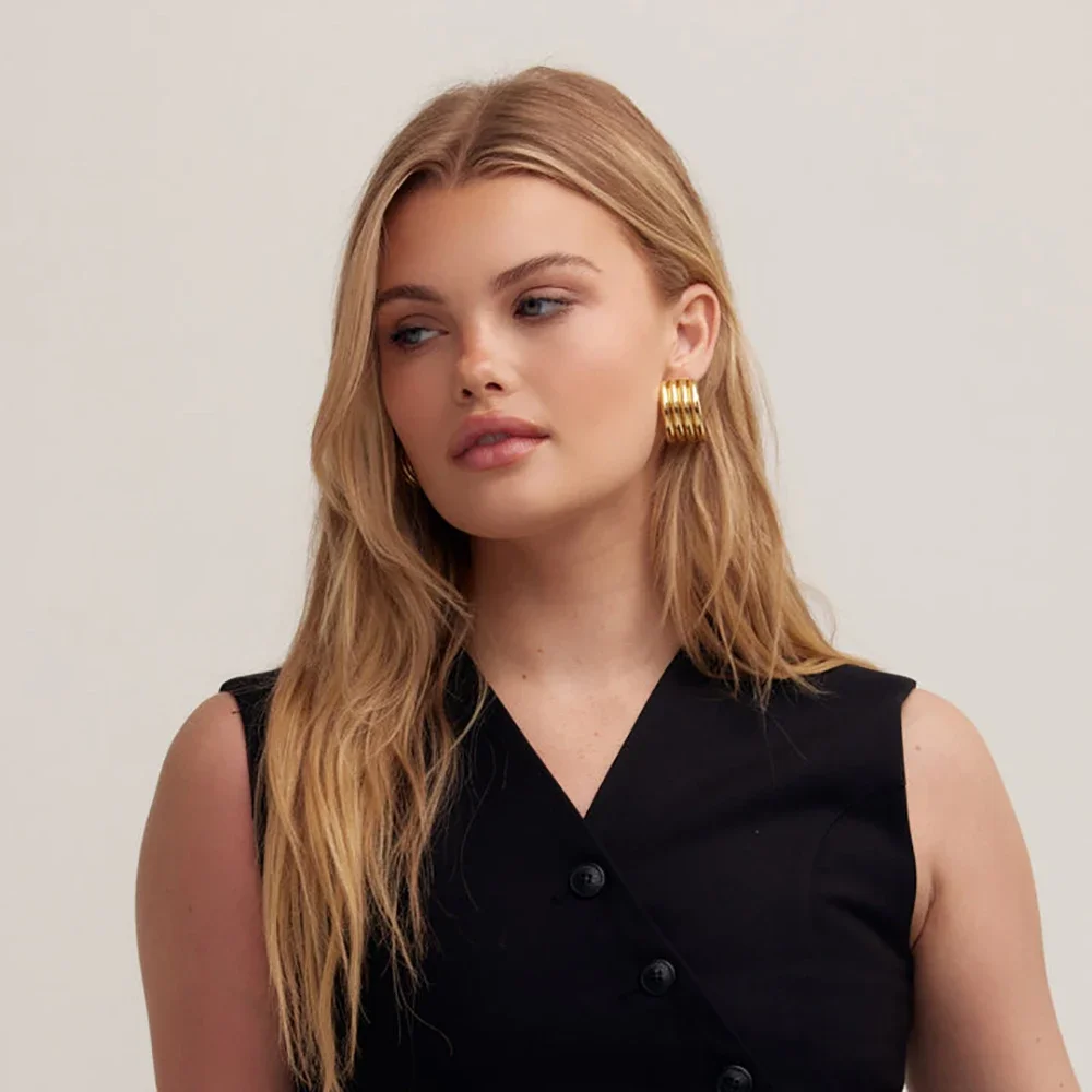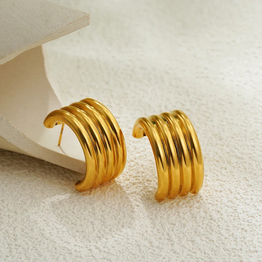Imagine elevating your style with these stunning hoop earrings that capture modern elegance and bold charm. Crafted from high-quality stainless steel, they shine with a radiant gold finish that adds warmth and sophistication to any outfit. Their round shape features a unique multilayer striped texture, giving them a contemporary and textured look that’s sure to turn heads. These earrings are designed to be lightweight yet durable, making them perfect for long wear at parties, weddings, or casual outings. Waterproof and free from high-concern chemicals, they offer both beauty and peace of mind. With their sleek design, you’ll feel confident and on-trend wherever you go, making them a must-have addition to your jewelry collection.