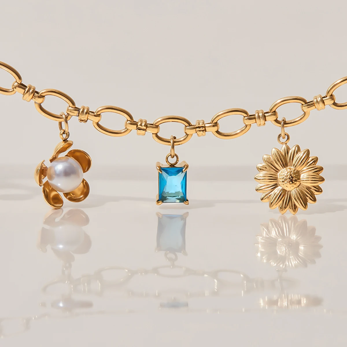Experience a blend of elegance and contemporary fashion with this beautiful gold stainless steel bracelet, designed to elevate your everyday look. Its sophisticated link chain design provides durability and versatility, making it perfect for casual or formal wear. Adorned with eye-catching charms, including a shimmering blue waterdrop rhinestone pendant and a delicate pearl flower, this bracelet adds vibrant accents to its luxurious gold tone. The lobster clasp ensures a secure fit, allowing you to wear it confidently all day long. Crafted from high-quality stainless steel, it is resistant to tarnish and hypoallergenic, assuring comfort and longevity. Whether you're treating yourself or gifting someone special, this trendy piece promises to turn heads.