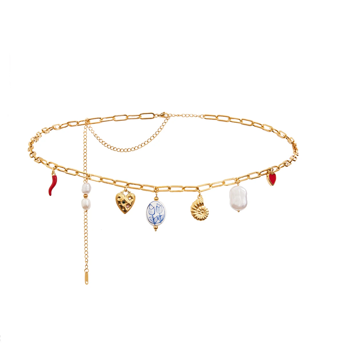 Elevate your style with this durable, hypoallergenic stainless steel waist chain featuring a shiny gold-tone finish. The layered double-chain design is adorned with playful charms including vibrant chili peppers, smooth faux pearls, a detailed gold heart, a delicate blue floral ceramic, and a textured gold shell, creating a bold yet vibrant aesthetic. Waterproof, tarnish-resistant, and free from nickel, lead, and cadmium, this stylish accessory offers long-lasting wear and ultimate comfort. The adjustable extension chain with a lobster clasp ensures a secure fit, making it a perfect statement piece to enhance casual or glamorous outfits with lively charm and modern elegance.