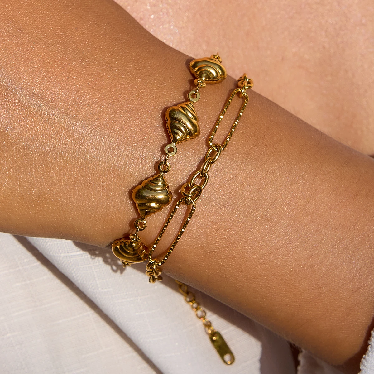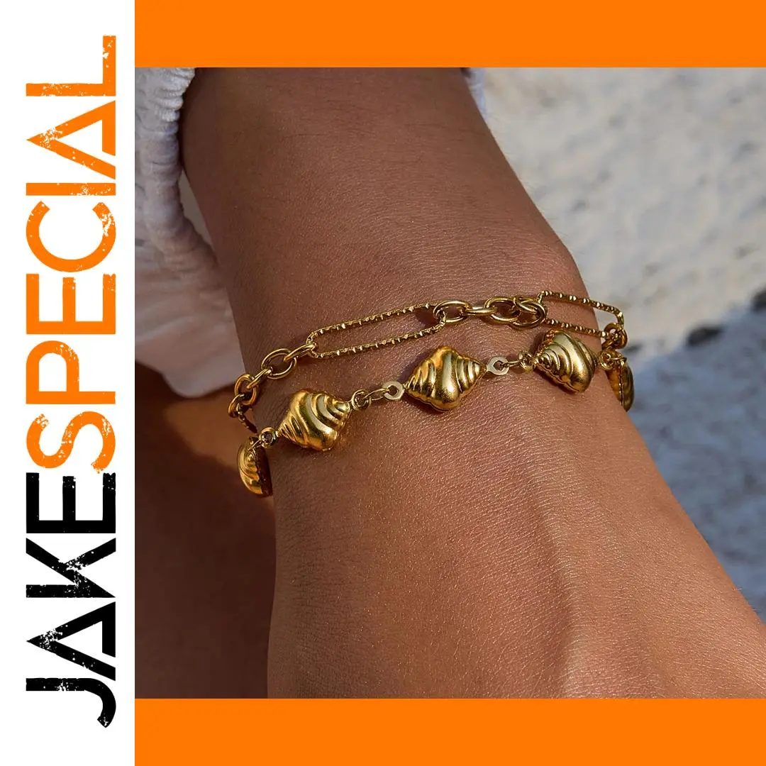 Imagine elevating your everyday style with this stunning gold stainless steel bracelet featuring a contemporary nautical design. The delicate link chain provides a refined touch, while the bold, shell-shaped charms evoke a seaside vibe, perfect for both casual and chic looks. The polished, shiny finish on the charms enhances their ocean-inspired contours, creating a harmonious blend of elegance and trendiness. Equipped with a reliable lobster-claw clasp, this bracelet ensures a secure fit for daily wear. Its versatile design makes it easy to stack with other jewelry pieces, adding a touch of coastal charm to your wardrobe. Own it today and feel the confident beauty of this stylish, ocean-themed accessory.
