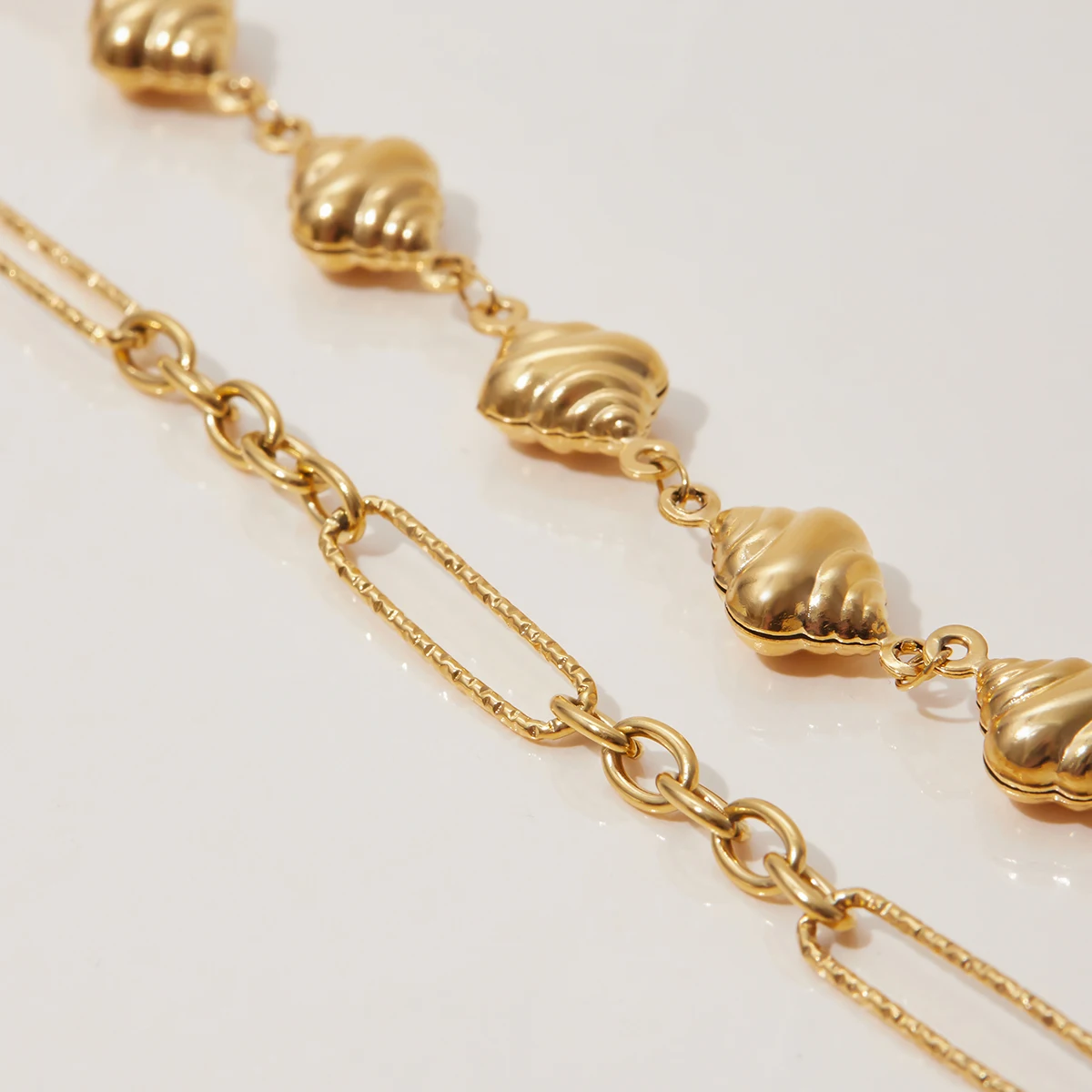 - Features a fine link chain with textured surface elements, offering an elegant foundation for the standout shell-shaped charms.