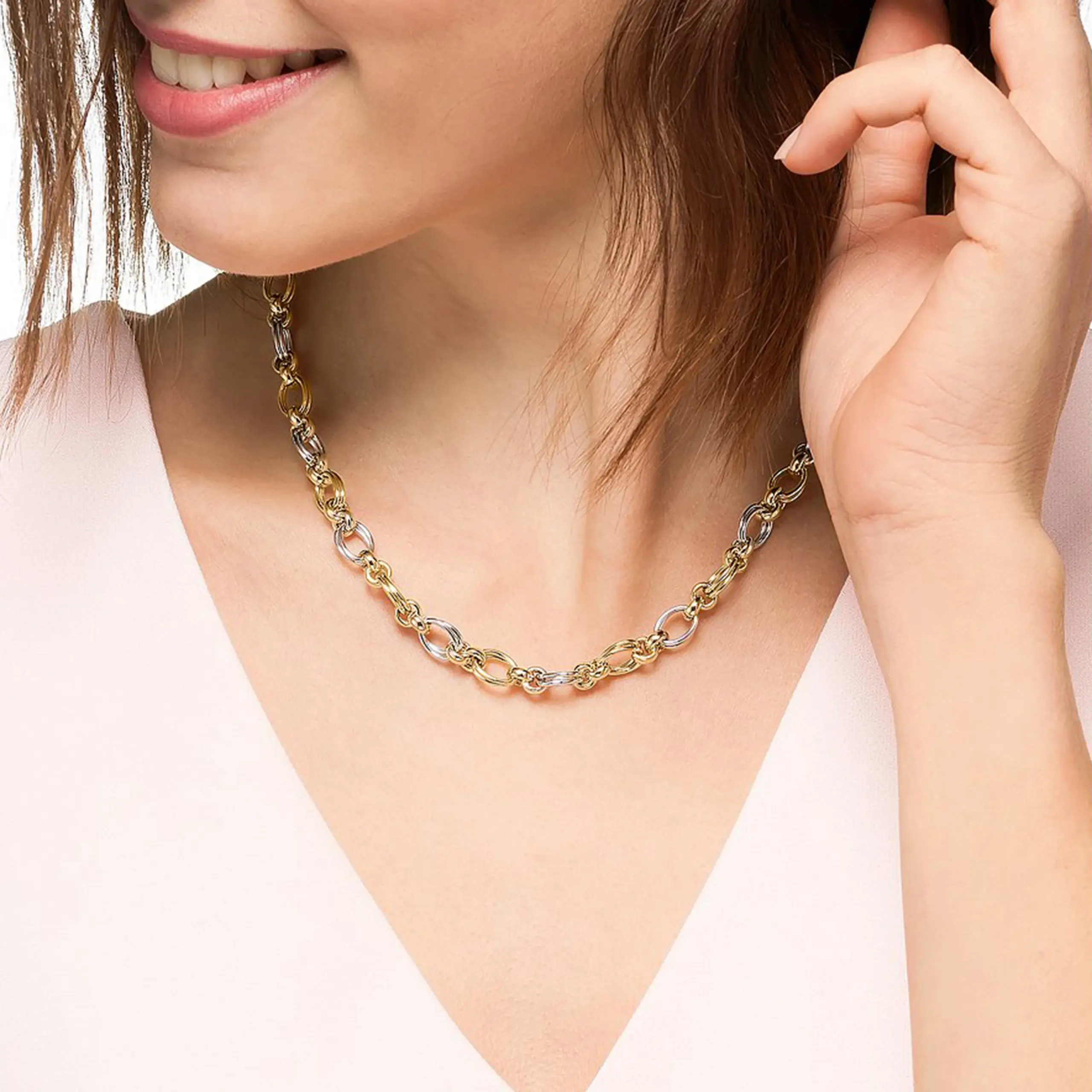- Features an O-chain style with a variety of link shapes—rounded, oval, and elongated—providing a modern, versatile design suitable for various outfits.