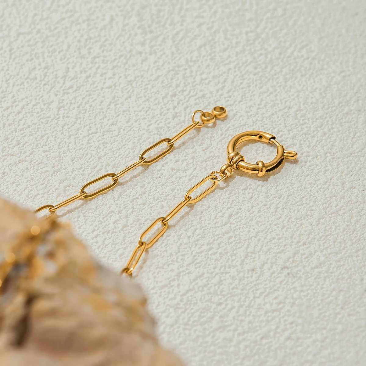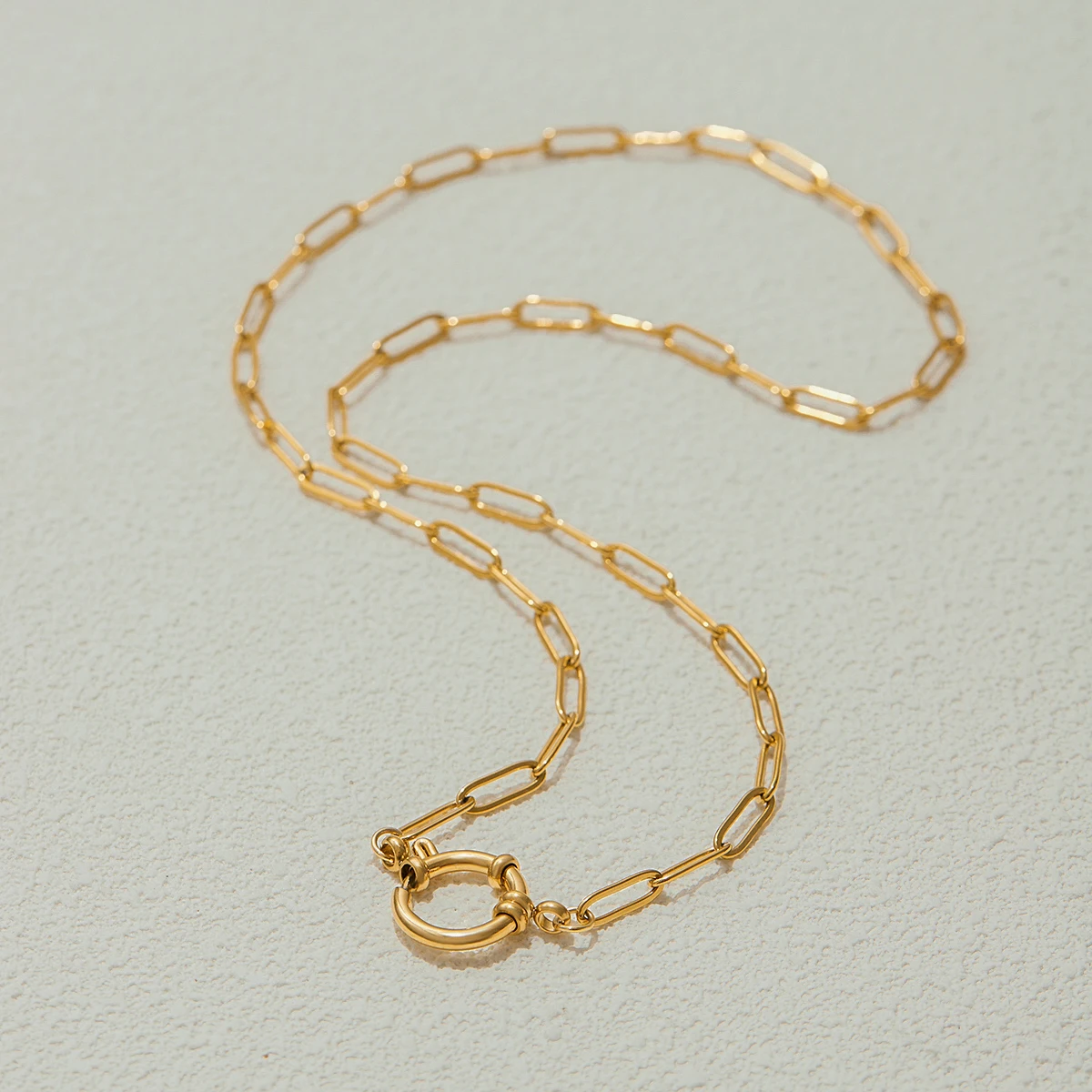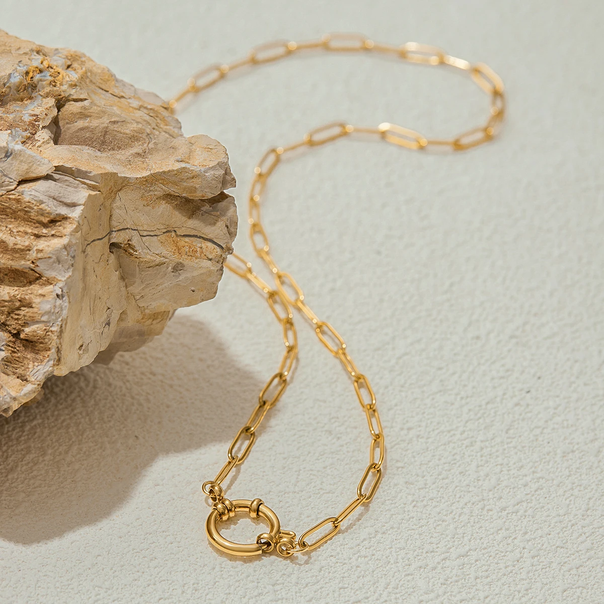 The JDN0203025 stainless steel necklace features a bold gold-colored chain with large rectangular links, offering a sleek, minimalist design perfect for casual and sporty looks. It showcases a circular sailboat buckle and dangling charms—a textured gold disc and an engraved tulip flower—adding nautical charm. A small red accent enhances its playful yet elegant appeal. Crafted from high-quality stainless steel with a polished finish, this versatile link chain measures approximately
