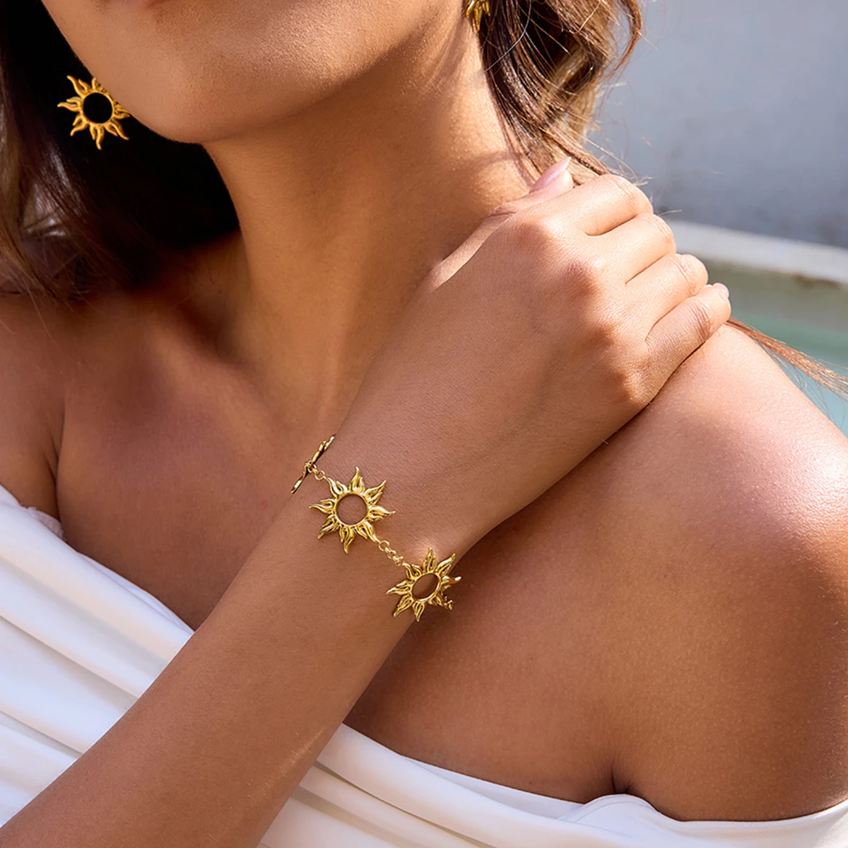 - Features two radiant sun-shaped charms with hollow centers and pointed rays, adding a trendy and distinctive sun motif that draws attention and complements all styles.