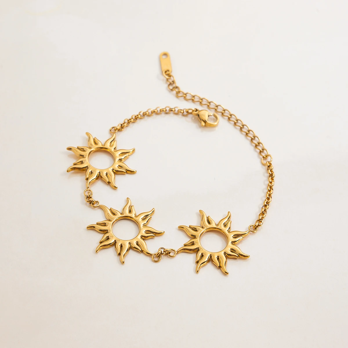 Imagine yourself wearing this elegant, minimalist gold-colored stainless steel bracelet that effortlessly elevates your style. Featuring two charming sun-shaped charms with hollow centers and radiant rays, it combines modern trendiness with timeless appeal. The delicate link chain, composed of small oval links, ensures a comfortable fit and a sleek appearance. Its shiny finish reflects light beautifully, making it suitable for parties, casual outings, or as a thoughtful gift. The secure lobster clasp guarantees ease of wear and peace of mind. Crafted with high-quality stainless steel, this jewelry piece is durable, stylish, and designed to complement any outfit. Experience the perfect blend of fashion and sophistication with this eye-catching accessory.