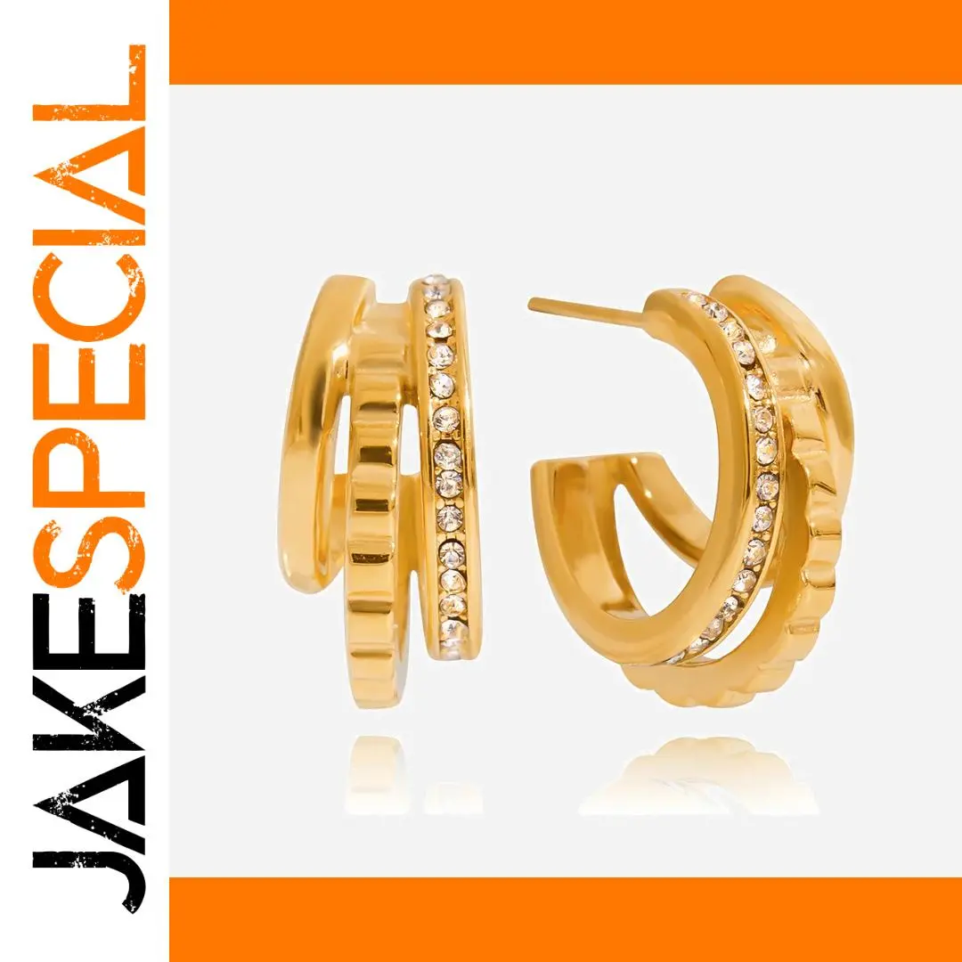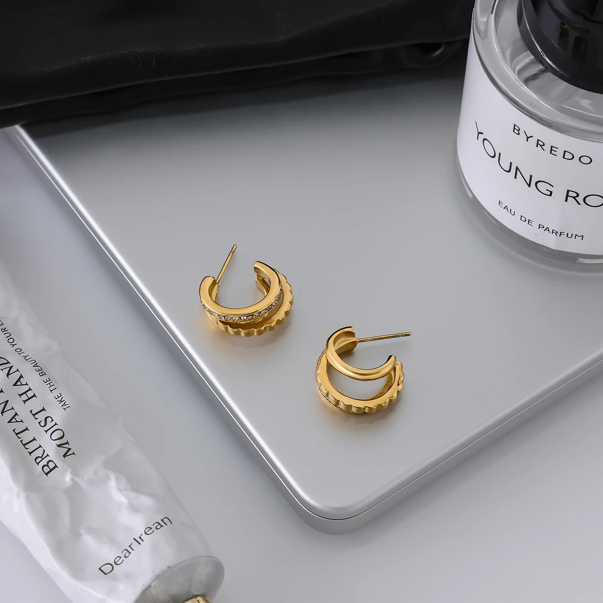 Experience timeless sophistication with these stunning gold stainless steel C-shaped earrings. Featuring a sleek three-layer openwork design, they showcase a modern minimalist aesthetic with a gentle, geometric curve that naturally enhances your style. The polished gold finish reflects light beautifully, catching the eye and adding a touch of glamour to any outfit. Tiny white rhinestones delicately trace the inner edge of each earring, providing a subtle sparkle that elevates their luxurious appearance. Despite their bold, chunky look, the layered structure keeps them lightweight and comfortable for all-day wear. Versatile and elegant, these earrings seamlessly transition from casual daytime looks to formal evening events, making them a must-have accessory for confident women who appreciate contemporary style with classic charm.