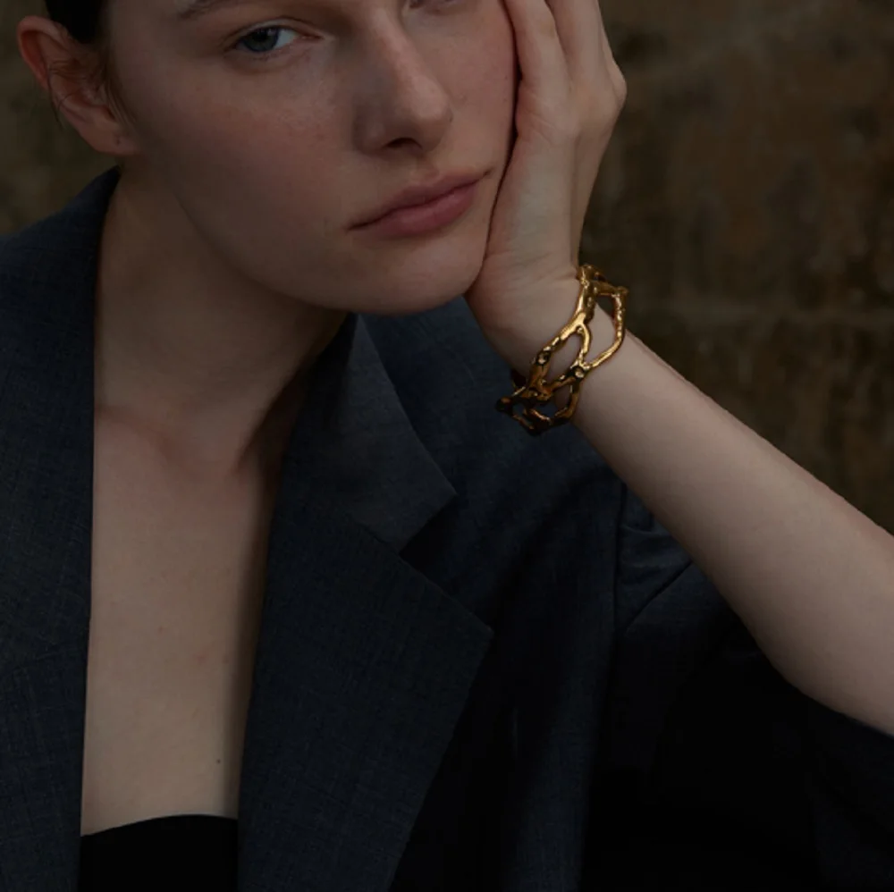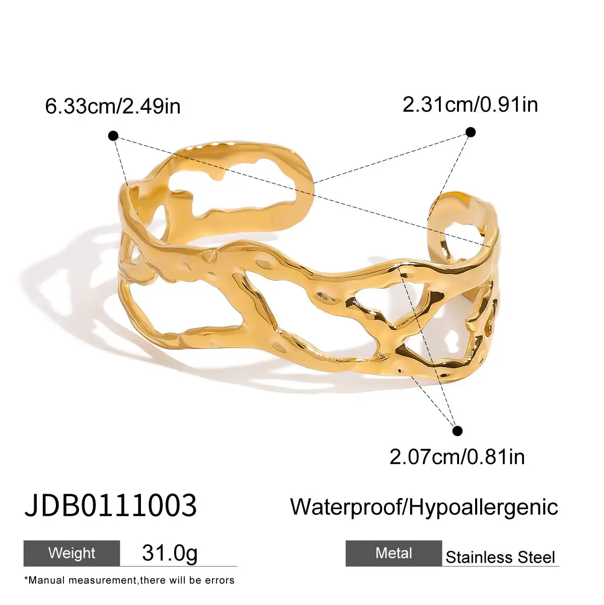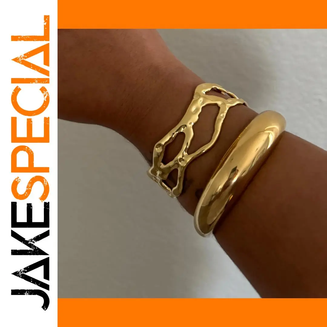 Enhance your style with this minimalist stainless steel cuff bracelet, featuring a hollow irregular wave design and exaggerated waveform pattern. Crafted from durable stainless steel with a PVD gold finish, it offers a long-lasting, scratch-resistant, and waterproof surface that resists fading. Weighing approximately 15 grams, this jewelry piece is nickel, lead, and cadmium-free, ensuring both safety and elegance. Its sleek, modern aesthetic combines smooth and textured finishes, creating a bold yet sophisticated look. Perfect for stacking or wearing alone, this versatile gold-toned bracelet adds a touch of contemporary artistry to any outfit, making it an ideal accessory for those who appreciate refined, artistic jewelry.