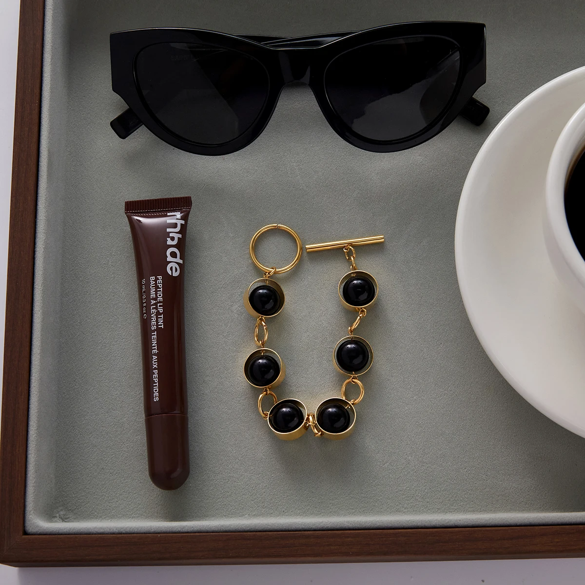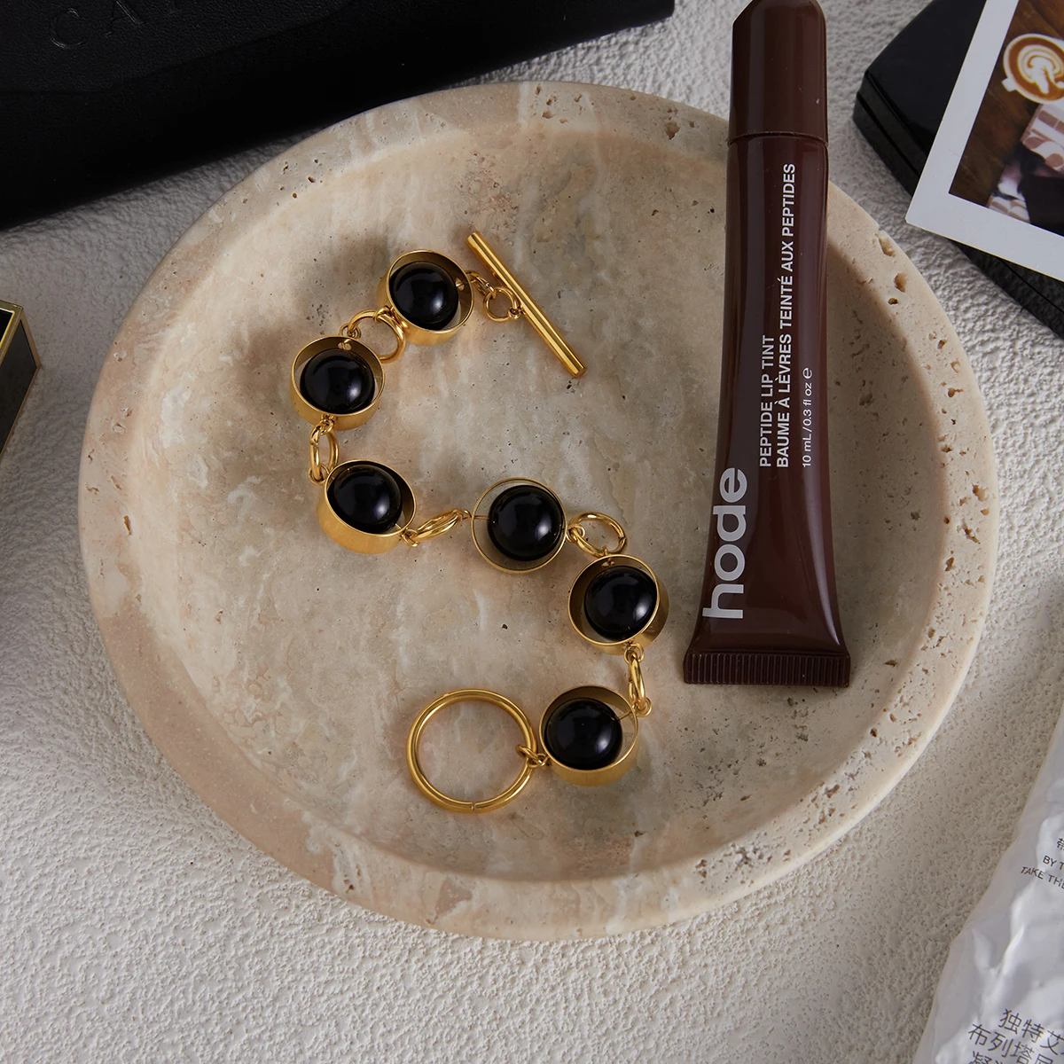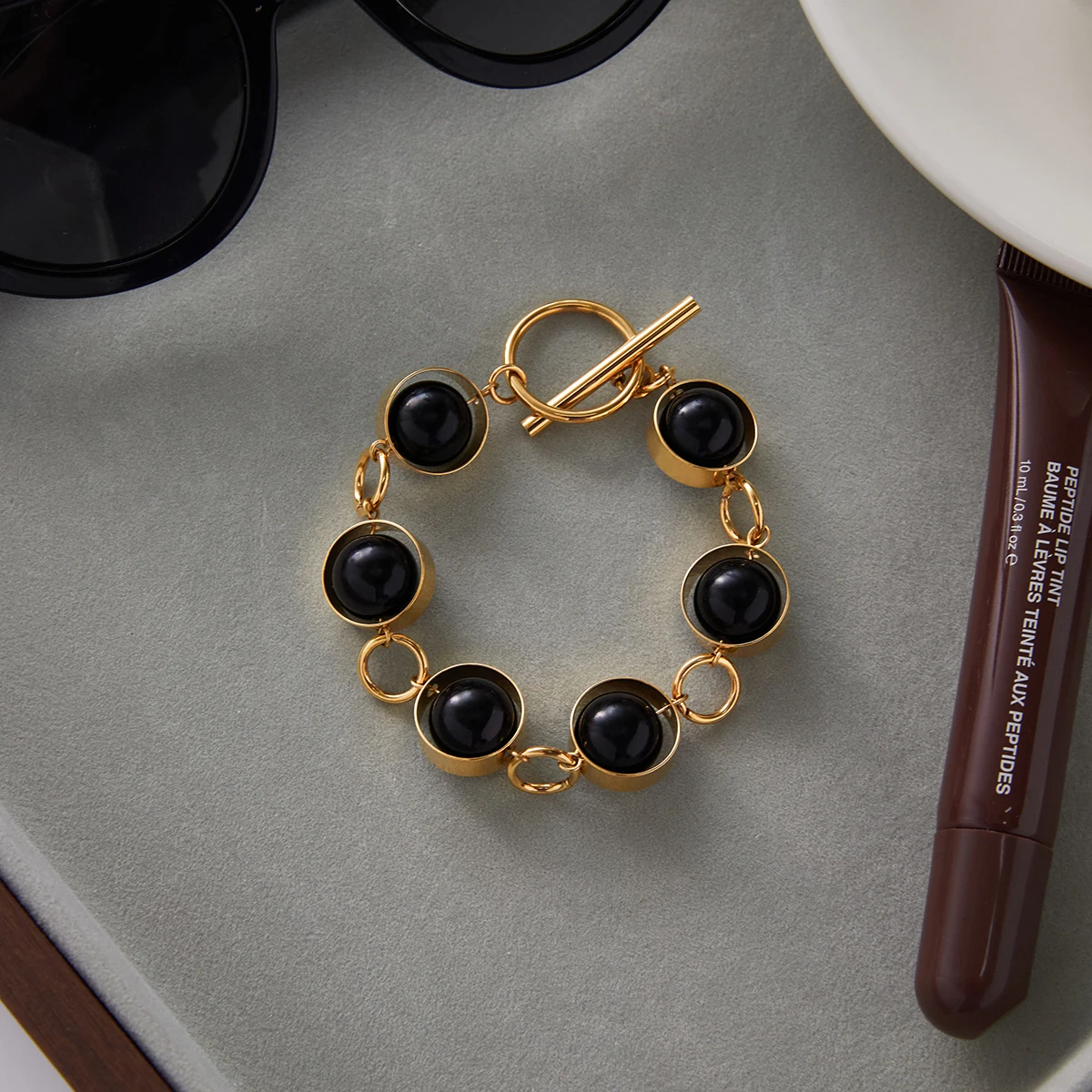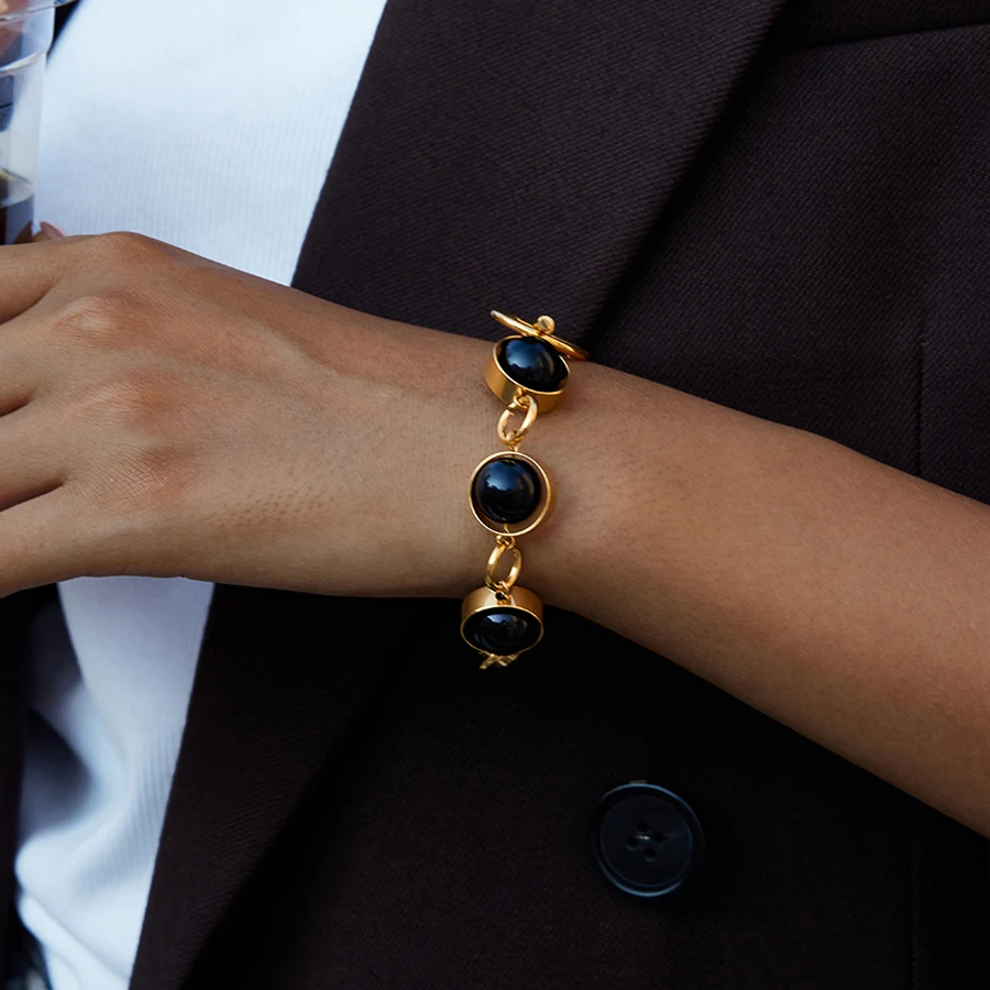 - Decorated with large, smooth black glass beads, evenly spaced along the chain, providing a sleek, modern contrast to gold tones.