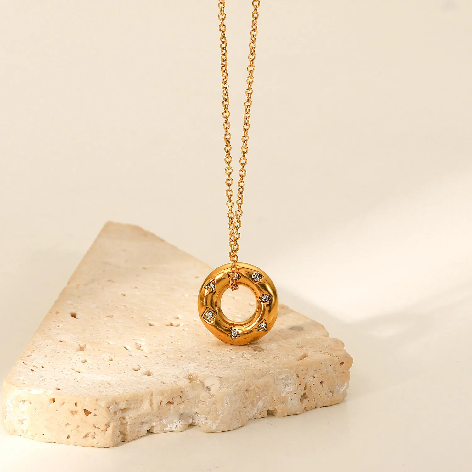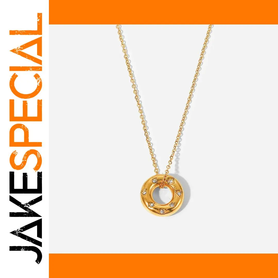 Elevate your style with this women's necklace featuring a 15.63mm hollow circular pendant crafted from high-quality stainless steel with a luxurious gold finish. Its smooth, polished surface radiates a luminous shine, creating an elegant and modern look. Tiny, sparkling cubic zirconia stones are embedded evenly across the pendant, adding a delicate shimmer that catches the light beautifully. The classic link chain, composed of small, durable, and closely connected loops, complements the pendant perfectly, offering both comfort and sophistication. Whether for casual outings or formal events, this versatile piece enhances any outfit with refined simplicity. Its hypoallergenic, tarnish-free material ensures long-lasting beauty and everyday wear comfort, making it an essential addition to your jewelry collection.