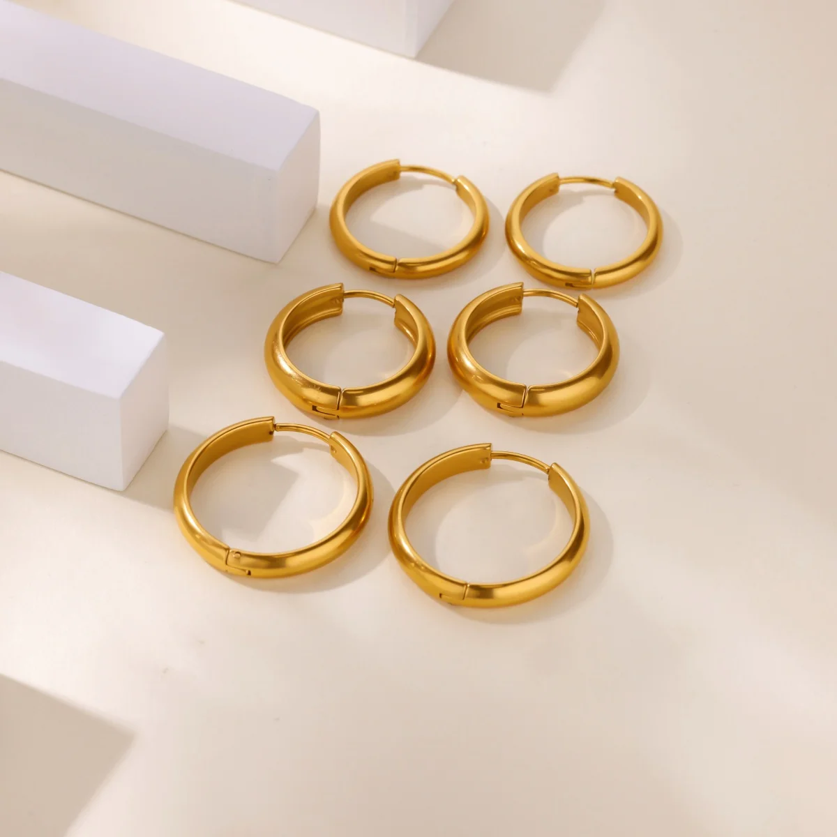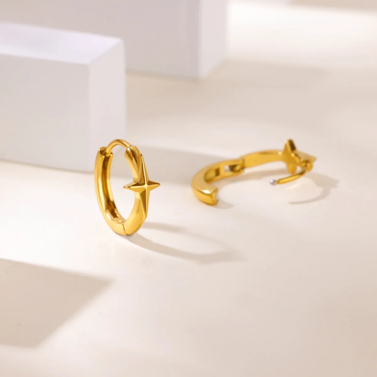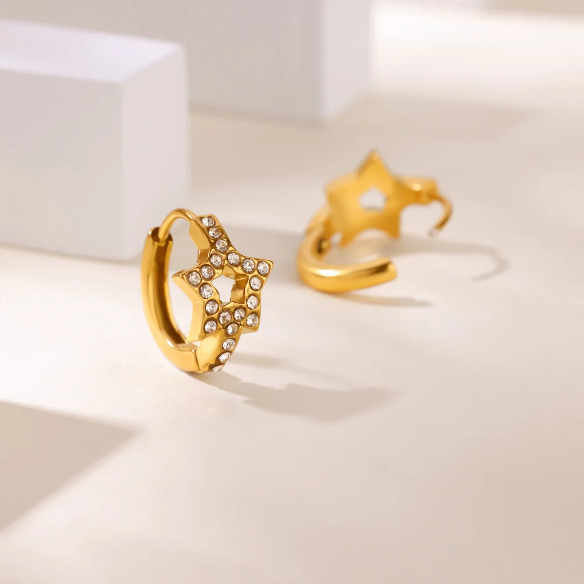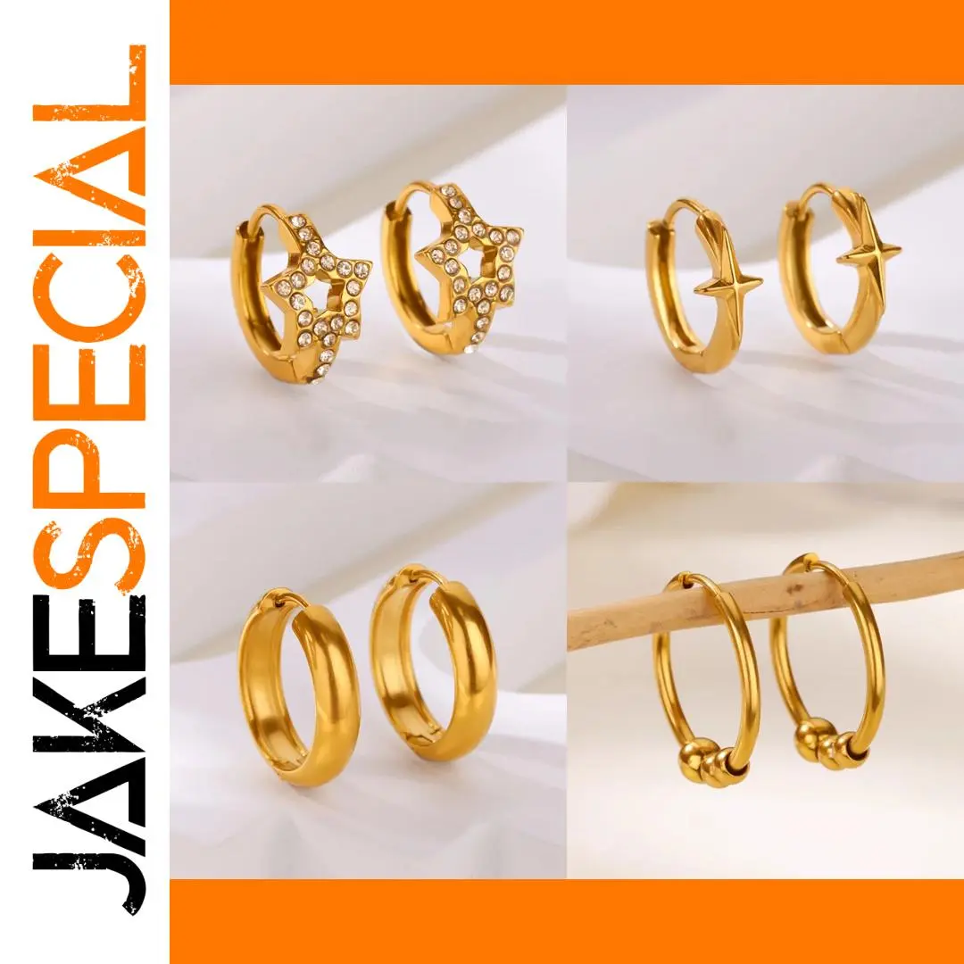 Transform your look with this stunning collection of gold-tone stainless steel zircon star hoop earrings. Designed for women who appreciate both style and sophistication, these earrings combine trendy and classic elements. The star-shaped hoops adorned with sparkling zircon stones add a glamorous touch, perfect for both everyday wear and special occasions like weddings. The geometric pattern and polished finish create a modern, eye-catching aesthetic. Made from durable stainless steel, these earrings feature a convenient push-back closure for comfort and security. Whether you're gifting yourself or a loved one, these earrings ensure you'll always shine. Embrace elegance and modernity with this eye-catching jewelry collection, suitable for various personal styles and events, making every moment special.