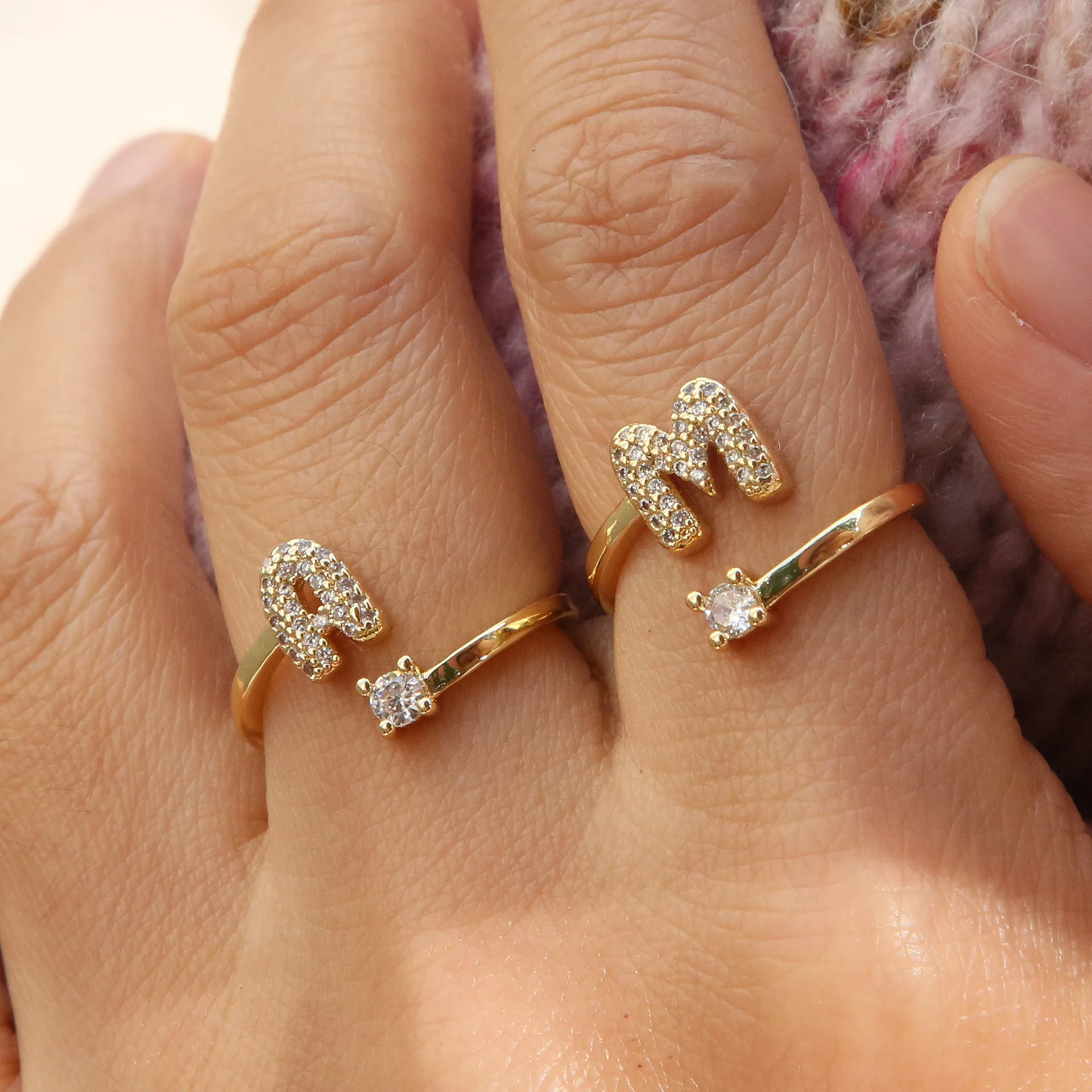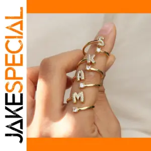 - Each ring has cubic zirconia inlays, with “A” and “M” heavily encrusted for shimmer, while “K” and “E” offer a more understated sparkle, blending elegance with modern style.