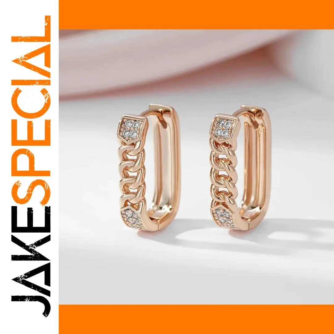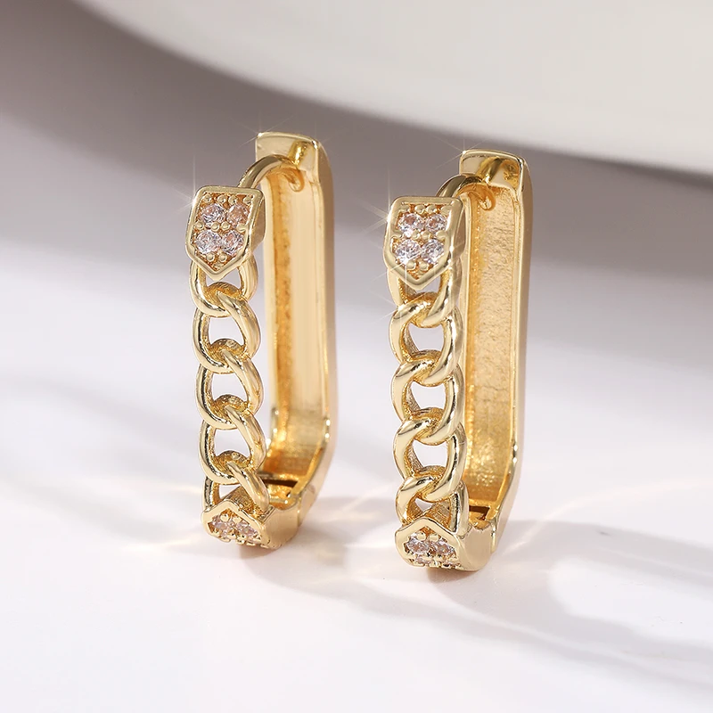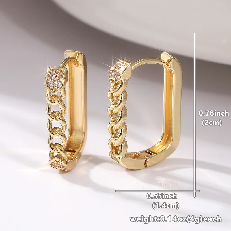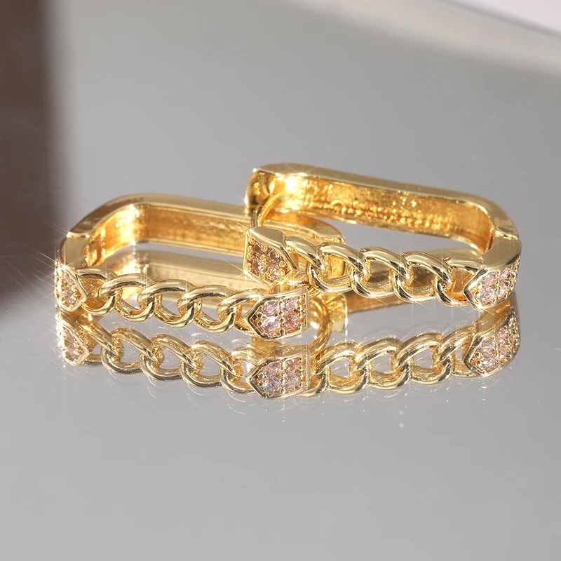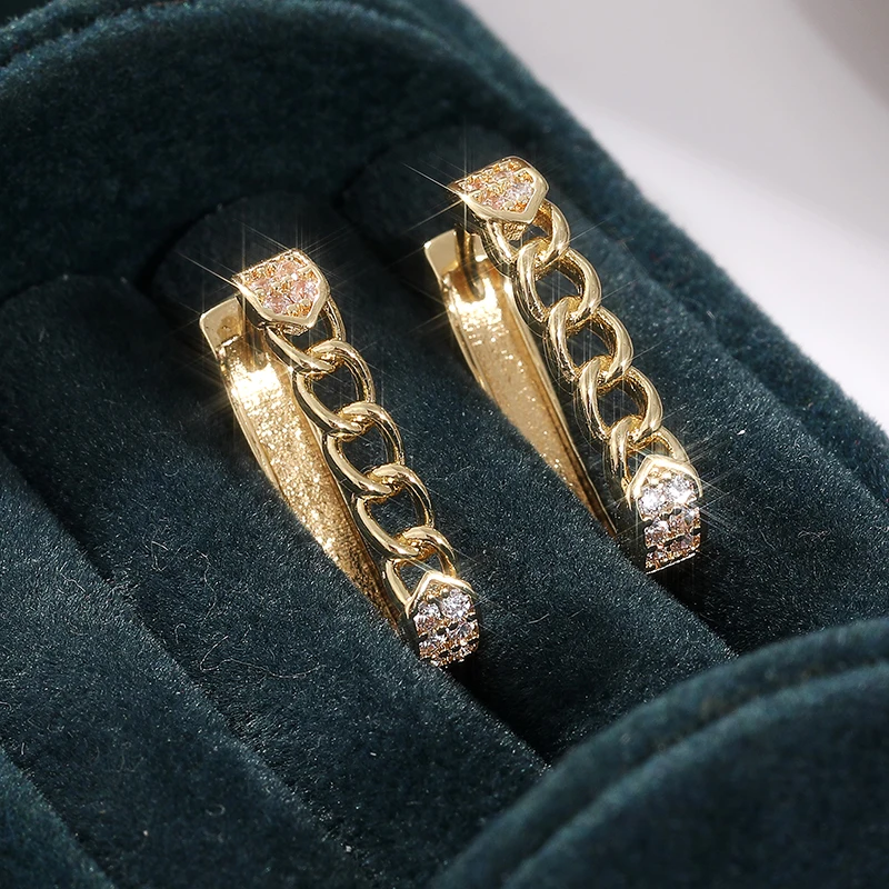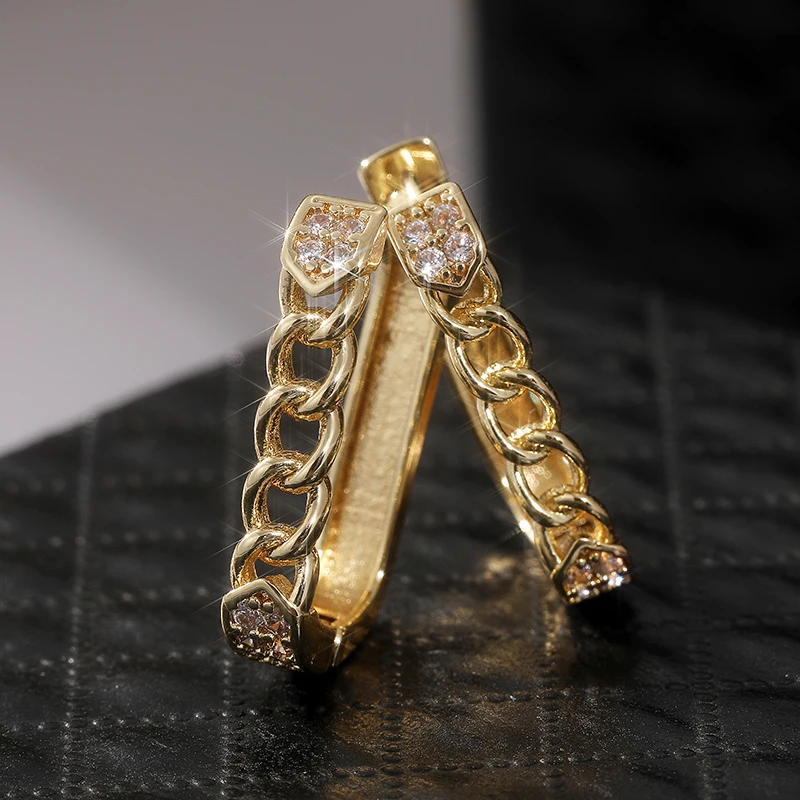 Step into sophistication with this stunning pair of gold-colored drop earrings. Crafted from high-quality copper alloy and adorned with sparkling cubic zirconia stones, these earrings blend trendy geometric design with timeless elegance. Their bold yet delicate rounded hoops are finished with a shiny polish that catches the light beautifully, making them perfect for both special occasions and daily wear. The chain-link detail adds a layered texture, elevating the overall look and creating a modern, fashionable statement. Whether you're attending a wedding, engagement, or simply want to add a touch of glamour to your everyday style, these earrings seamlessly combine style and versatility. Feel radiant and confident whenever you wear them, imagining the compliments you'll receive.