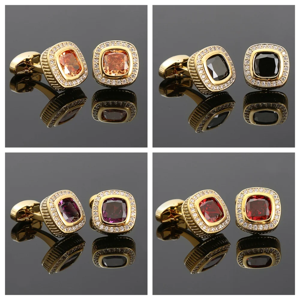 Experience the perfect blend of classic sophistication and modern elegance with this pair of gold-tone cufflinks. Crafted from alloy, these accessories feature a striking multicolored square gemstone design, including shades of black, white, red, and green, that immediately draws attention. The polished, shiny finish enhances their high-quality appearance, making them ideal for formal occasions, business events, or stylish gatherings. The layered, dimensional design surrounds a central square gemstone set in a bezel, accented with tiny clear stones for a luxurious shimmer. Wear these cufflinks to elevate your outfit and showcase your unique taste. Their versatile style matches various fashion preferences, providing a refined look for any attire or occasion.