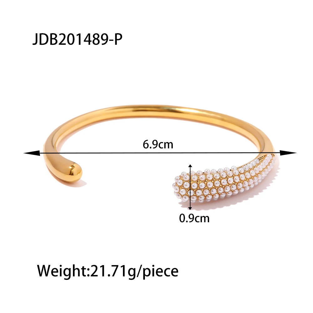 Experience the luxury and versatility of this stunning gold-tone stainless steel cuff bracelet. Its modern geometric open design provides a comfortable fit, while the smooth, curved edges create a sleek silhouette. Adorned with a vibrant rainbow gradient of cubic zirconia stones, it sparks with colorful brilliance, adding a lively touch to any outfit. The other side features a dense cluster of tiny white faux pearls, offering a refined textured contrast that exudes sophistication. Whether you're dressing up for a special event or elevating your everyday style, this bracelet's contemporary elegance makes it an essential accessory. Crafted for durability and waterproof use, it promises lasting beauty and effortless charm, suitable for various occasions and styles.