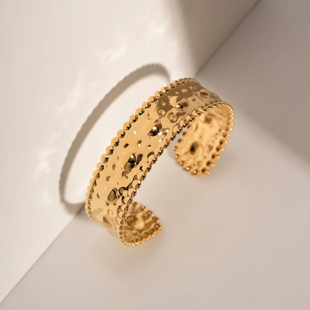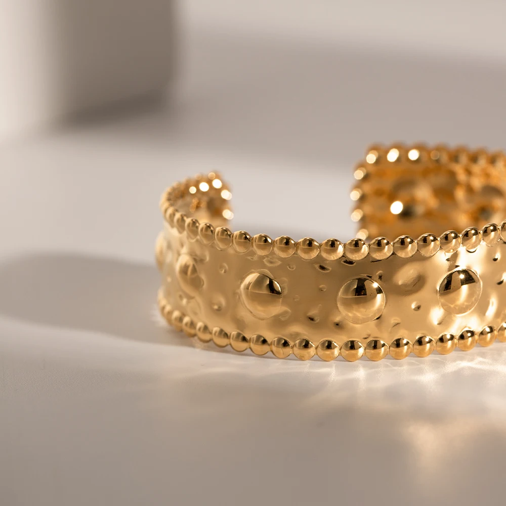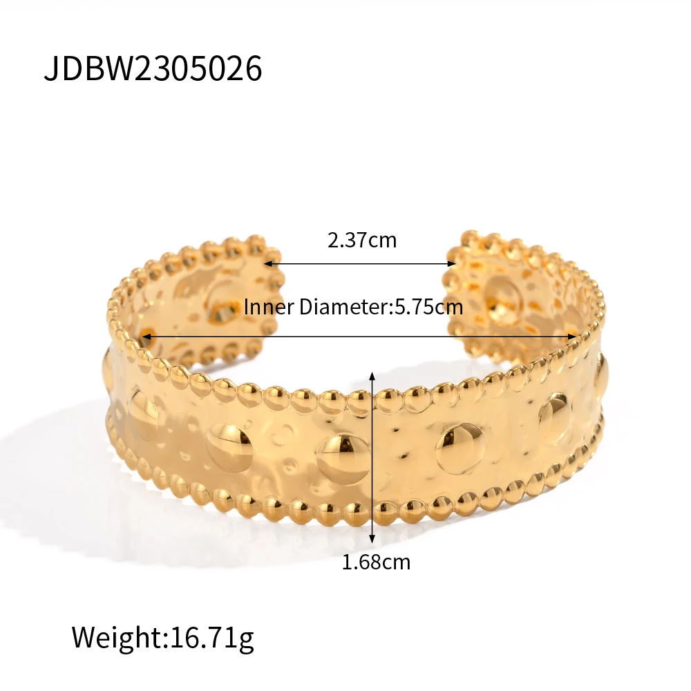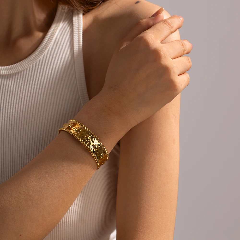 Experience the perfect blend of modern style and tactile sophistication with this stunning gold-tone stainless steel cuff bracelet designed for women. Its wide, round shape offers a bold, contemporary silhouette that elevates any outfit—whether you're dressing up for an evening out or adding a touch of elegance to your everyday look. The hammered textured surface creates a unique, rugged appearance that reflects light beautifully, adding depth and visual interest to your ensemble. Small, rounded bead details run along the outer edges, providing a delicate decorative contrast to the rugged face. Crafted from high-quality stainless steel with a shiny gold-colored finish, this accessory promises durability, longevity, and consistent elegance, making it a versatile addition to your jewelry collection.