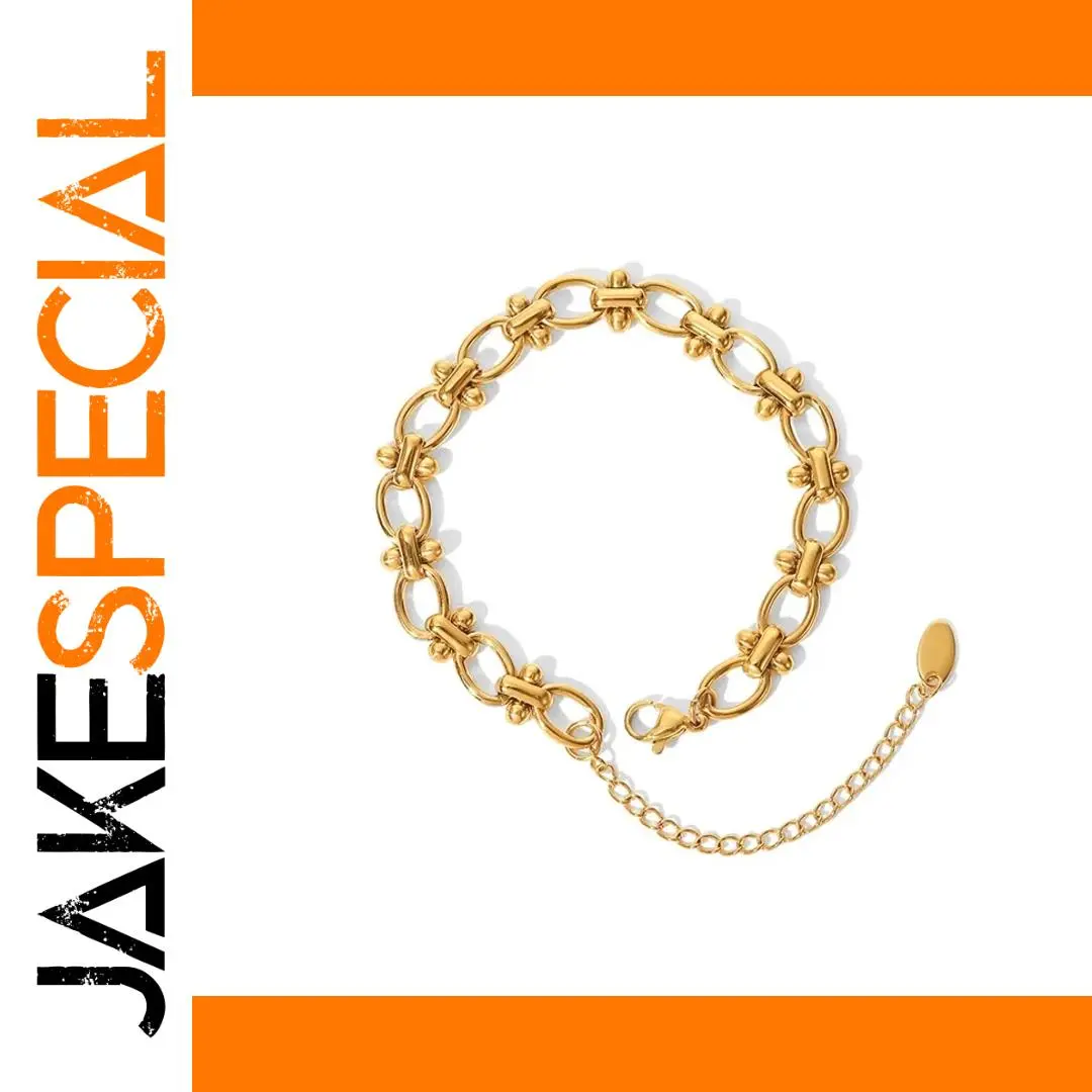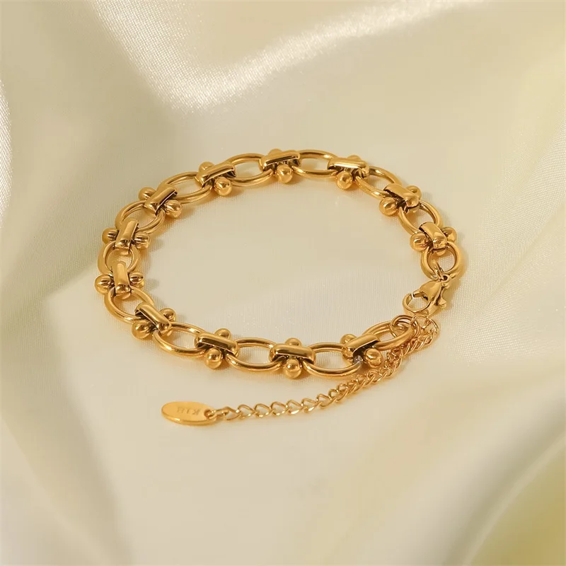 Experience the perfect blend of modern elegance and everyday versatility with this stunning gold-tone stainless steel bracelet. Crafted from durable stainless steel, it provides long-lasting shine and resistance to tarnishing, making it ideal for daily wear or special events. The interconnected oval and flat links feature textured small rounded bars, forming a unique geometric pattern that catches the eye. Its high-shine, smooth surface reflects light beautifully, adding a luxurious touch to your look. The adjustable lobster clasp with extension chain ensures a comfortable, customized fit for any wrist size. Whether worn alone or layered with other jewelry, this bracelet elevates your style effortlessly, helping you feel confident and sophisticated wherever you go.