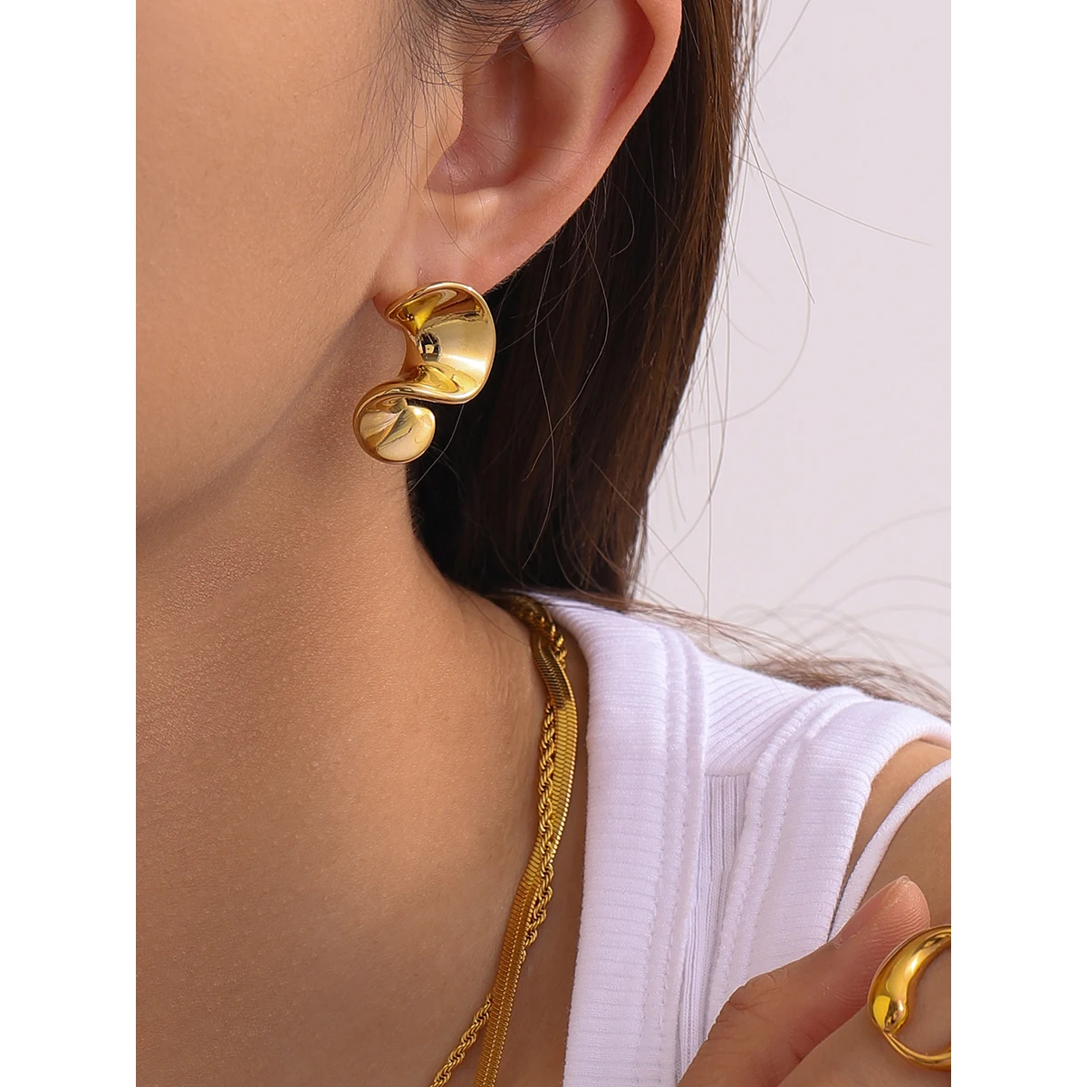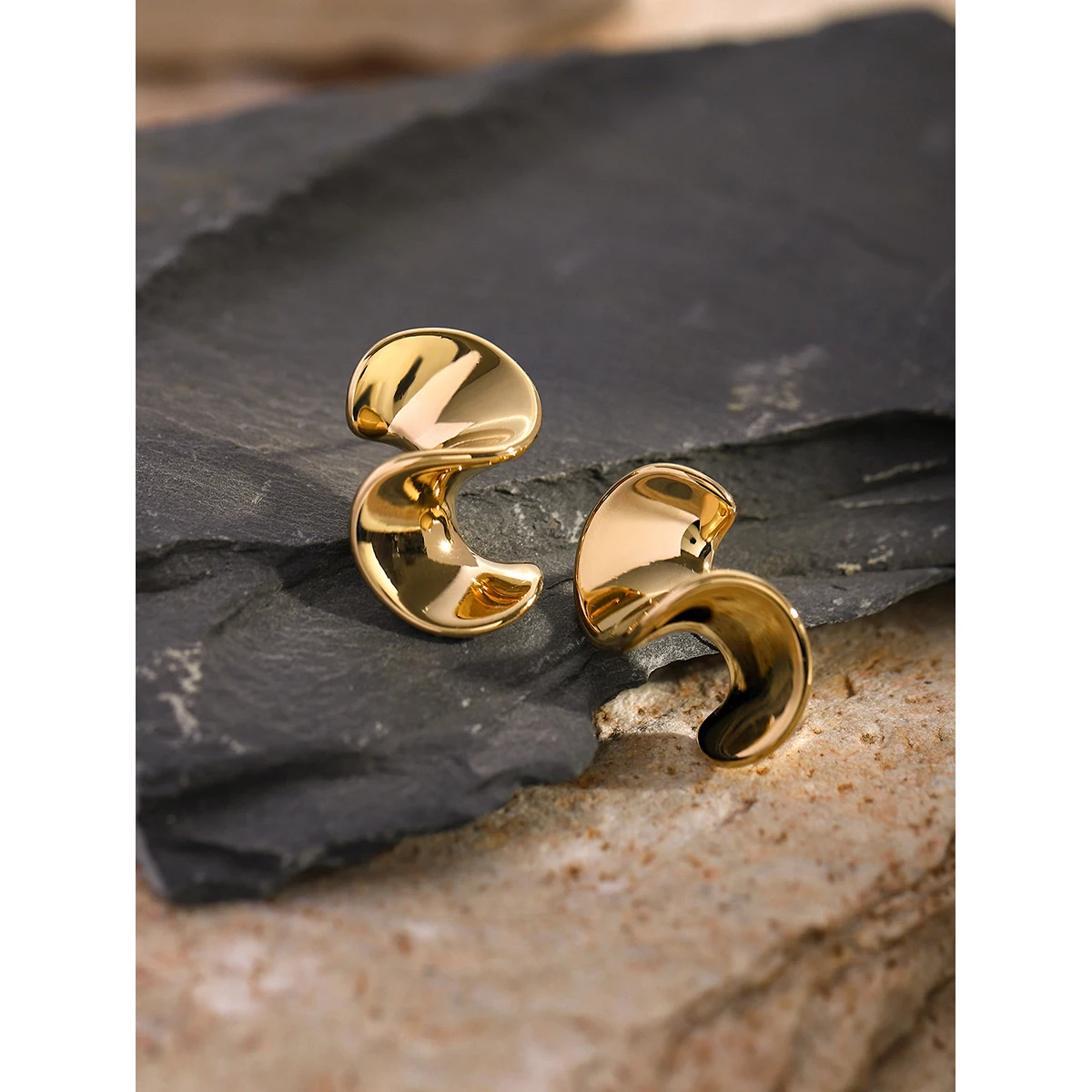 Experience the allure of these stunning modern earrings, meticulously crafted from durable stainless steel with a bright, reflective gold finish (color code JDE2403039). Their sleek, minimalistic spiral design showcases a bold, three-dimensional crescent shape, adding a contemporary touch to any outfit. The smooth, rounded edges provide exceptional comfort, allowing you to wear them effortlessly from day to night. Perfect for elevating casual looks or making a statement at special events, these earrings embody sophistication and modern elegance. Light reflecting beautifully off their polished surface, they instantly draw attention and complement your personal style. Designed for everyday wear or standout occasions, they are a versatile addition to your jewelry collection that promises both style and durability.