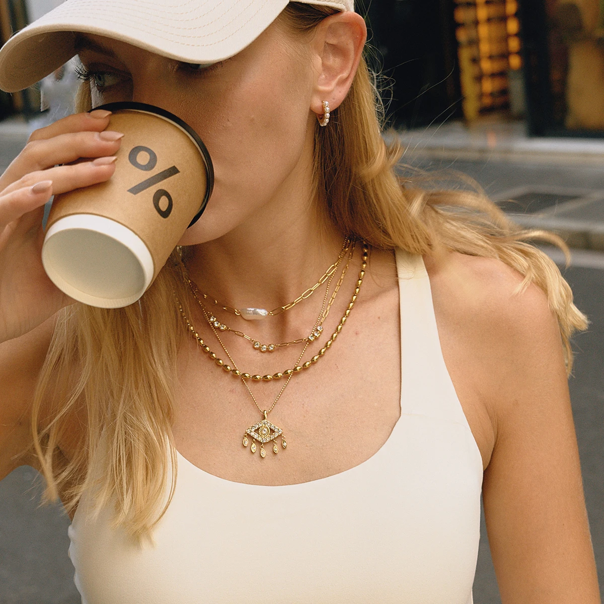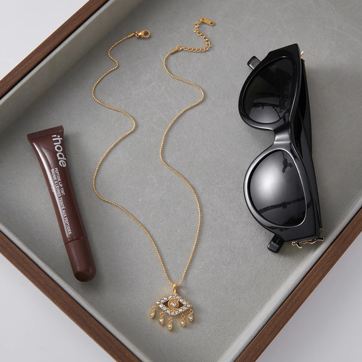- The centerpiece is a gold outline eye-shaped pendant embedded with sparkling white zircon stones, adding a luxurious and modern touch.
