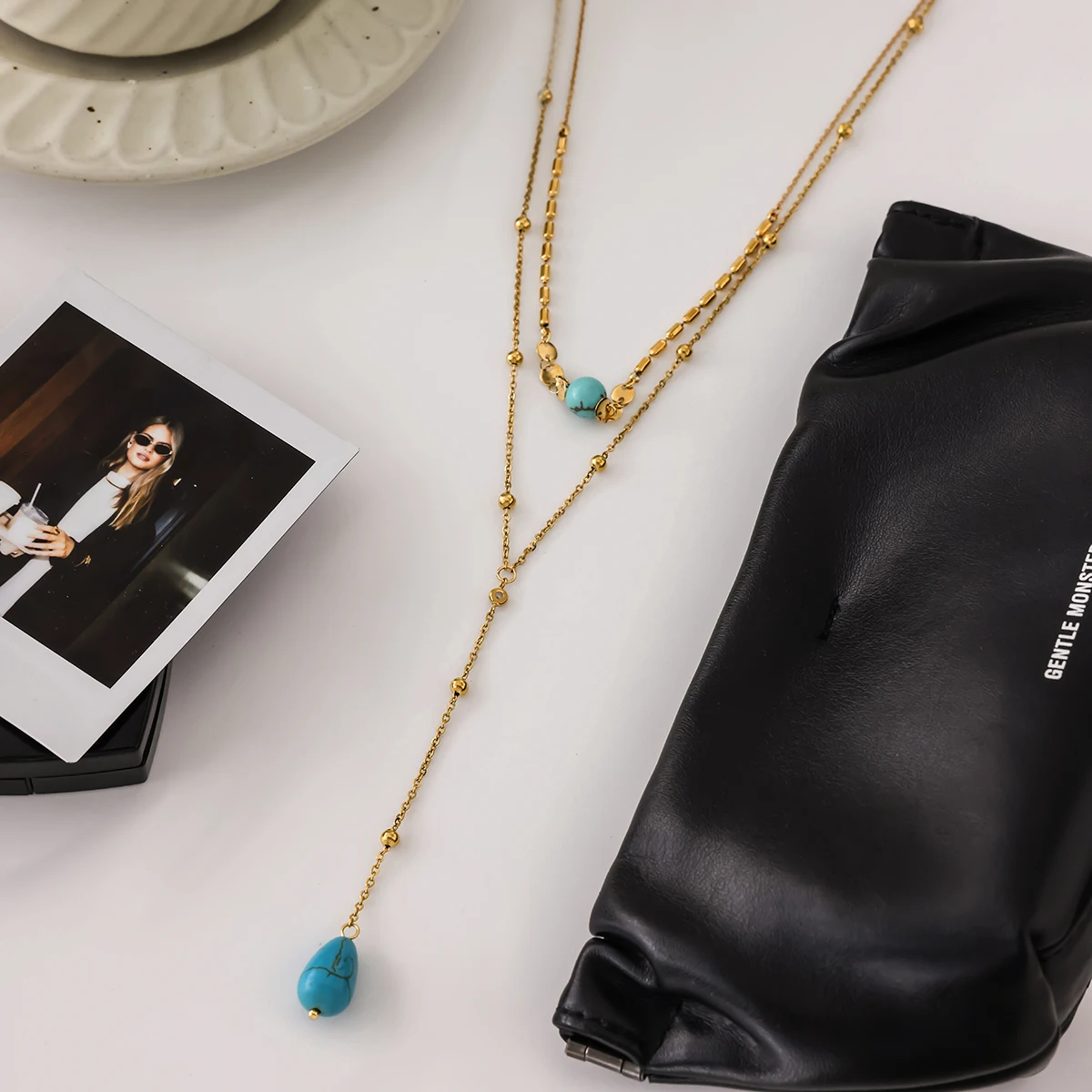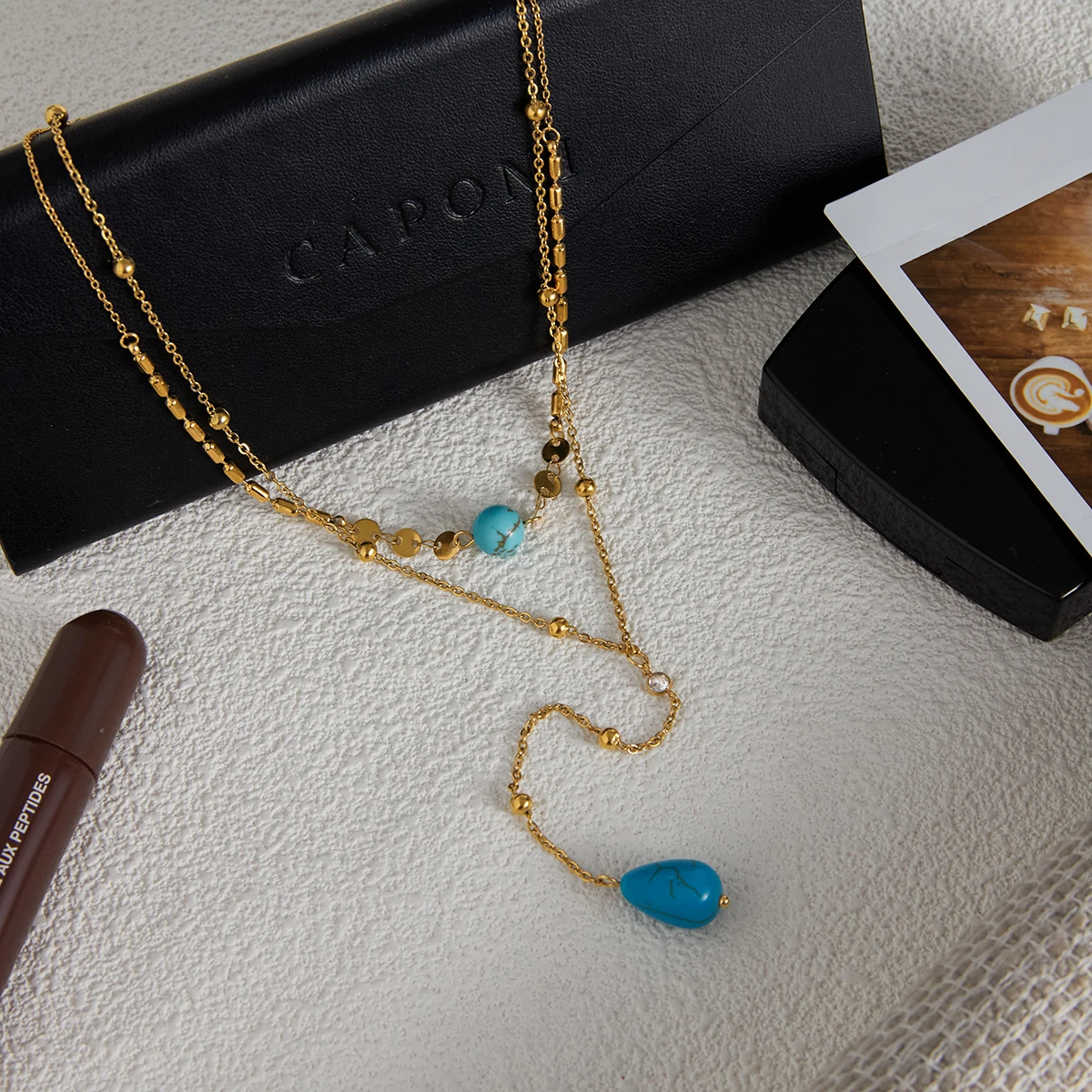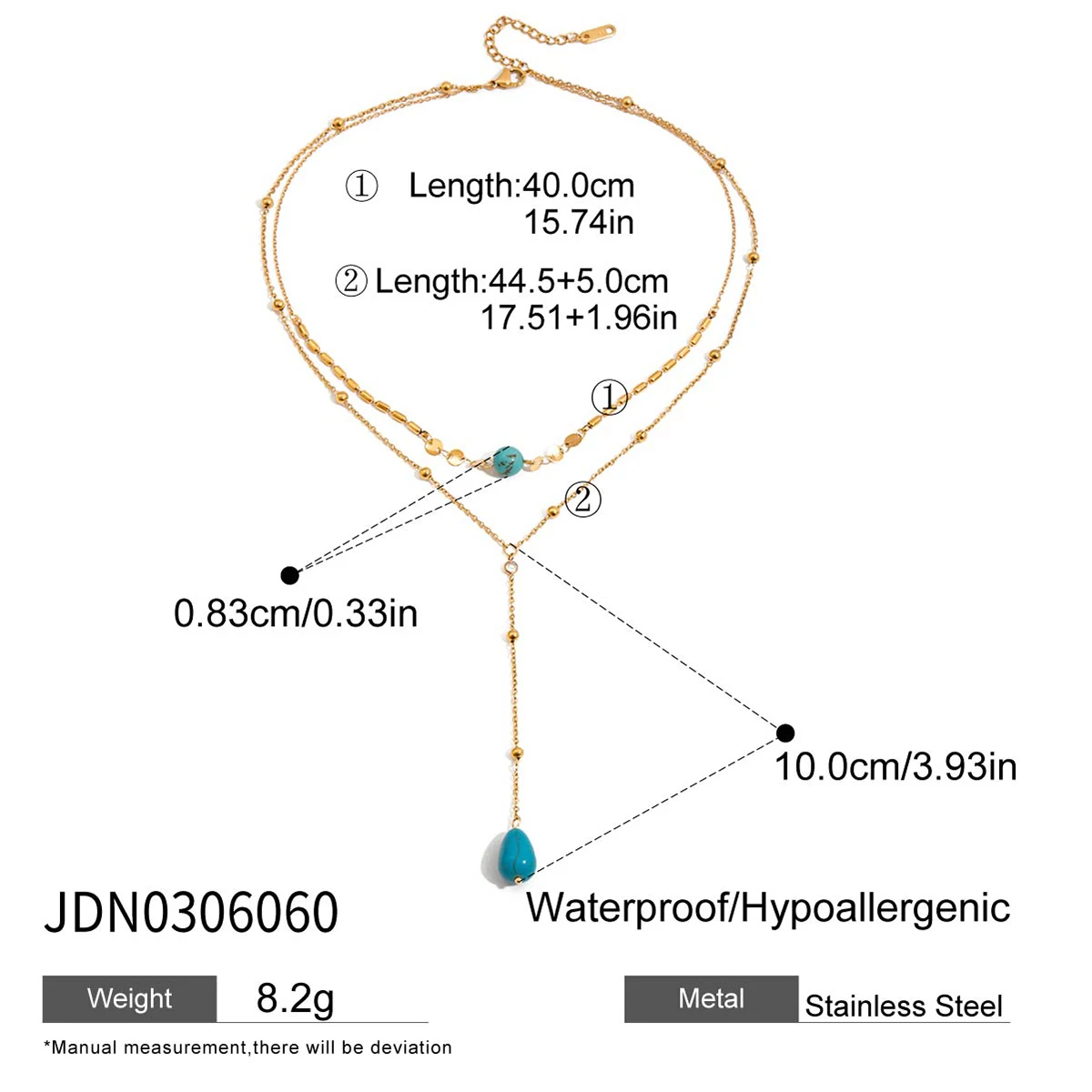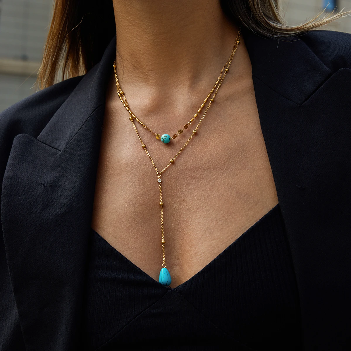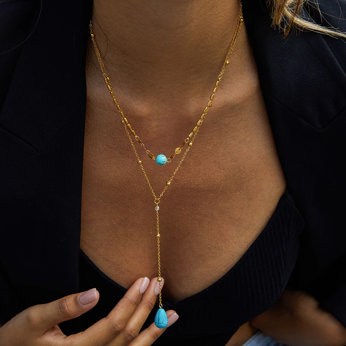 Imagine yourself wearing this exquisite layered necklace, adding a touch of elegance to your look. Its durable, waterproof stainless steel construction ensures lasting beauty, while the stylish turquoise accents make it a versatile choice for any occasion. This necklace will quickly become your go-to accessory, seamlessly blending sophistication with modern trends. Don't miss out on experiencing the confidence and charm it brings—order today and redefine your personal style with this beautiful jewelry piece!