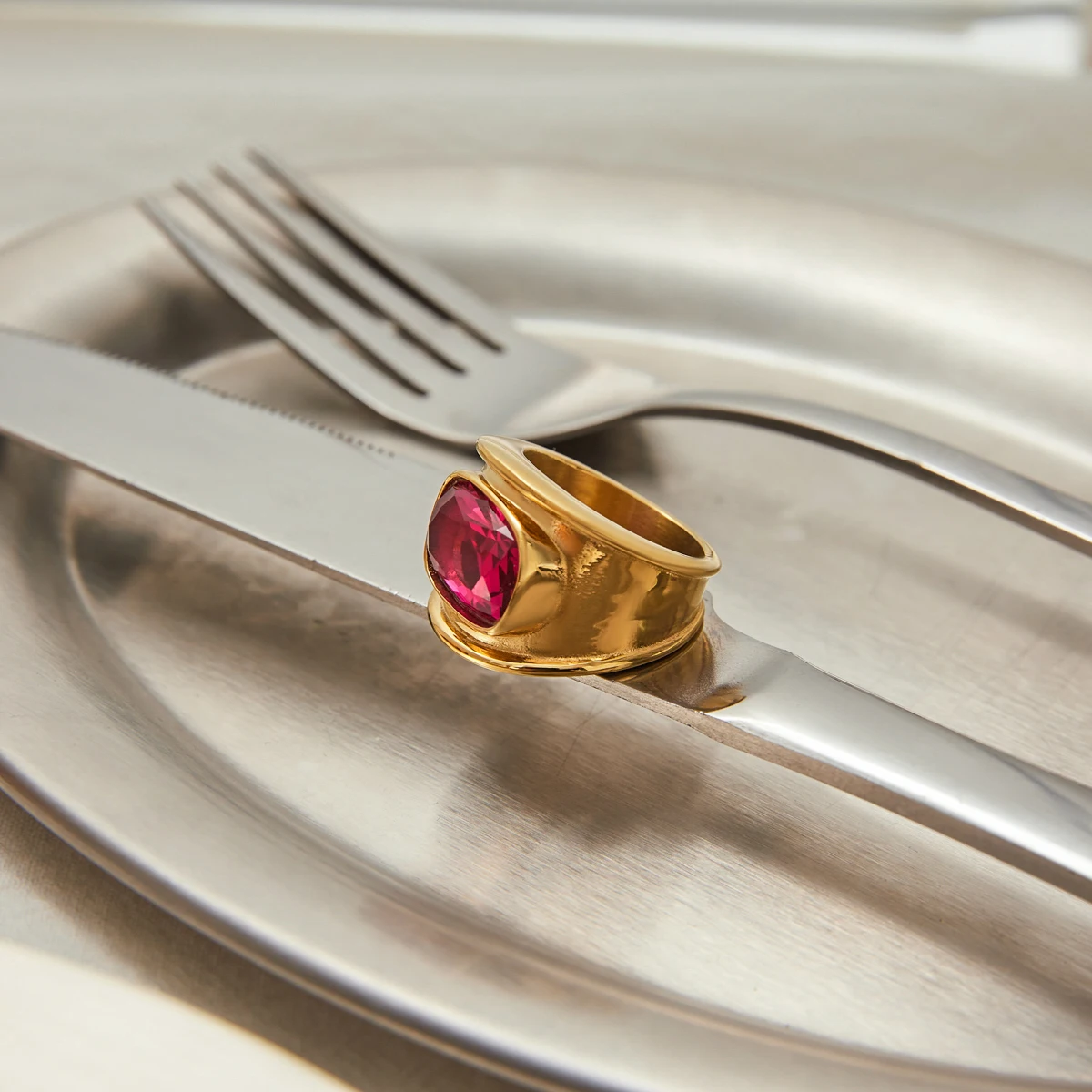 - At its center is a vibrant, faceted pink zirconia gemstone in an oval shape, producing a sparkling effect that captures light from all angles, perfect for making a statement.