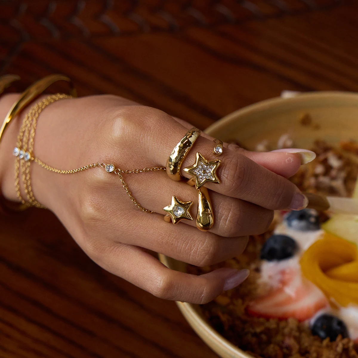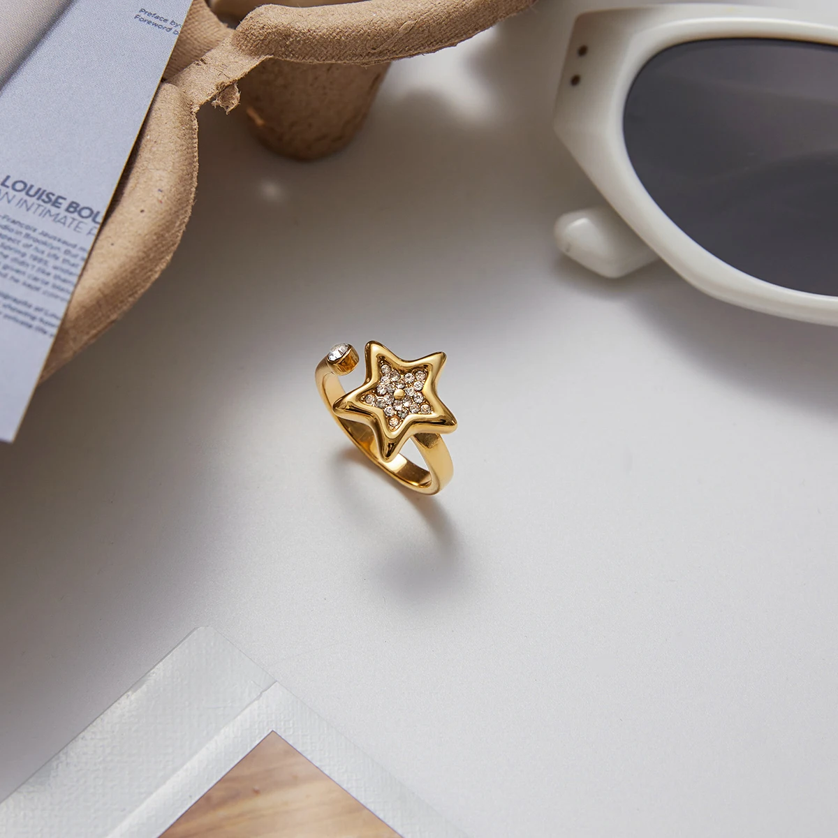 Step into your next fashionable event confidently, knowing you have an elegant and trendy jewelry piece that truly accentuates your style. This stylish gold stainless steel star ring is designed to impress and last, making it a perfect addition to your jewelry collection. Whether for a special occasion or everyday chic, this ring provides sophisticated charm and modern flair. Its durable stainless steel construction guarantees long-term shine, while the sparkling zircon stones add a dazzling touch. Don’t miss out on owning this contemporary, eye-catching accessory that’s tailored to enhance your unique beauty and sense of style. Add it to your collection today!