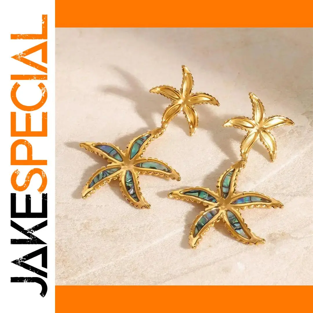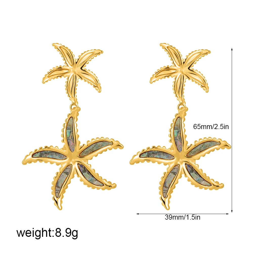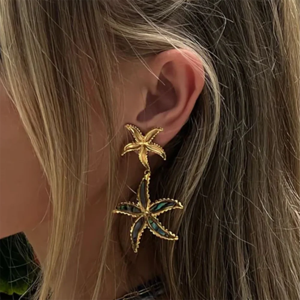 Experience the allure of the sea with these stunning gold-tone stainless steel drop earrings. Designed to resemble intricate starfish and star shapes, they combine luxury with trendy style. The earrings feature a polished, shiny finish that highlights their elegant gold color, making them perfect for summer outings, beach parties, or festive events. The textured, ridged details add realism and depth, while the dangling design creates a lively movement when worn. Suitable for women who want a versatile, eye-catching accessory, these earrings effortlessly complement casual or dressy outfits. Whether you’re looking to treat yourself or find an ideal gift, these earrings bring a touch of ocean-inspired beauty to any occasion.