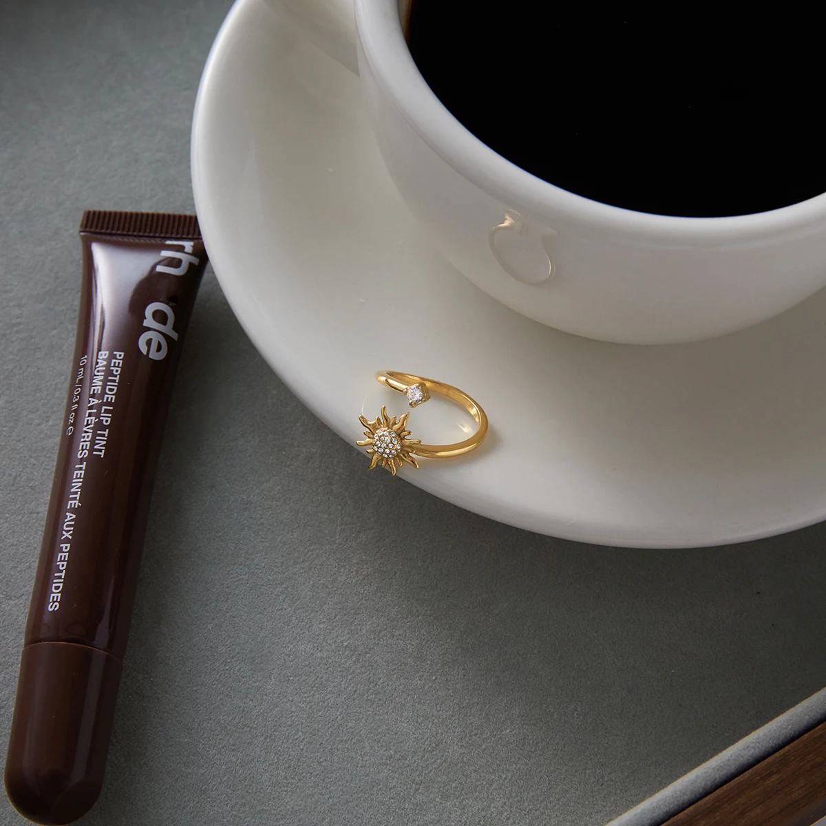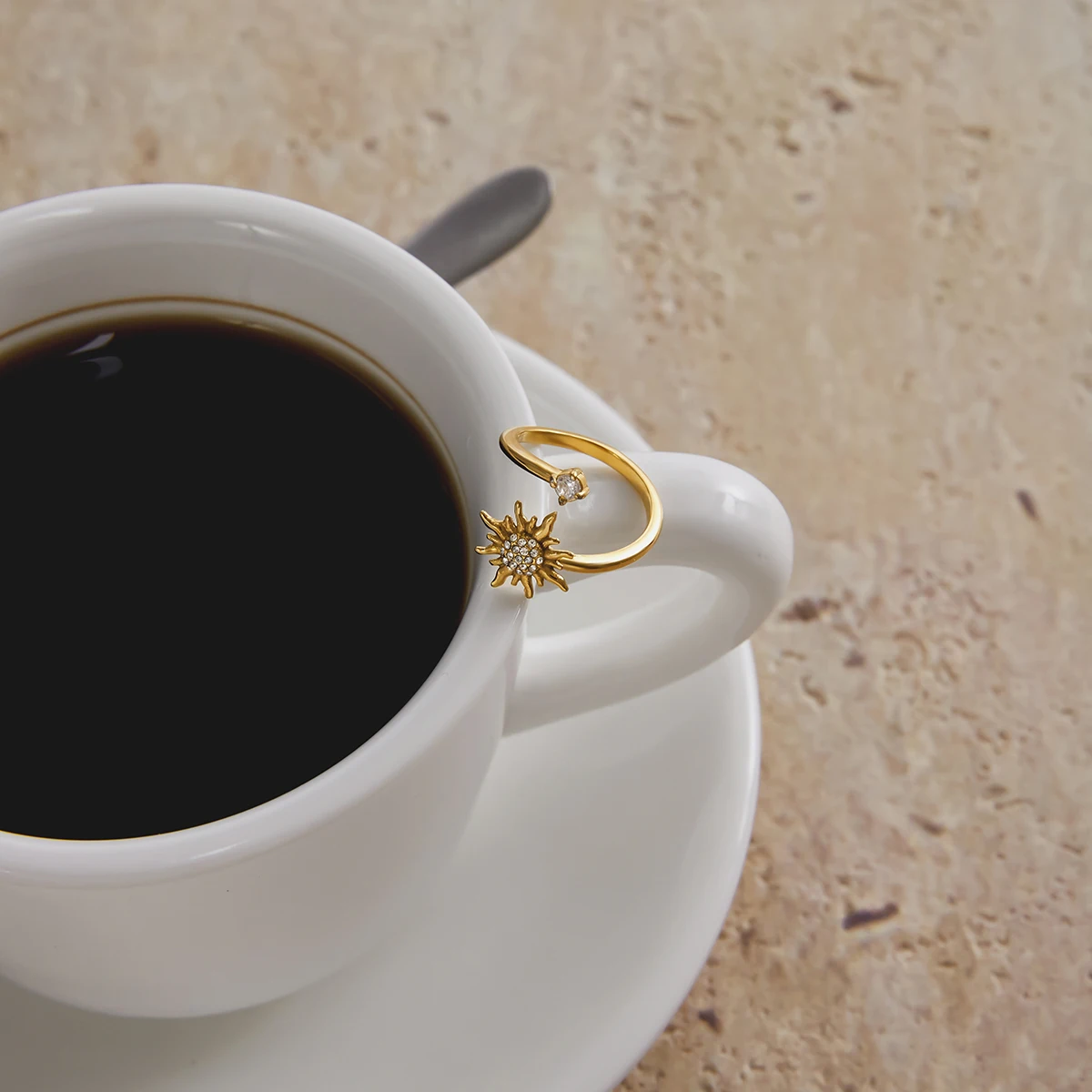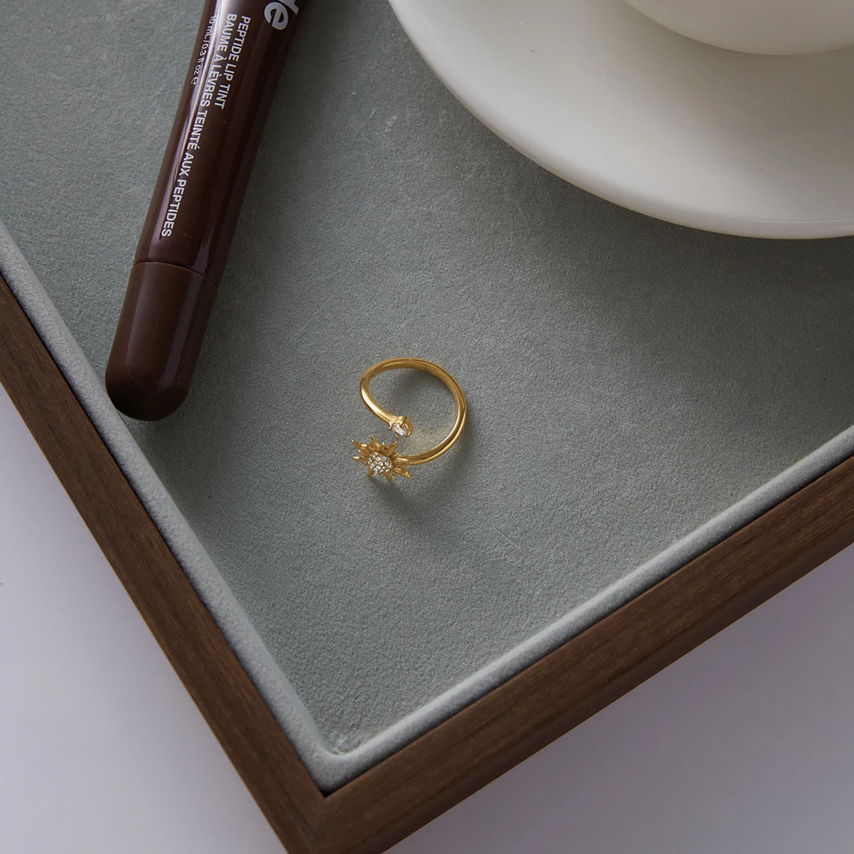 Enhance your jewelry collection with this trendy open ring featuring a gold-colored stainless steel design. The sun-shaped asymmetrical motif boasts radiating, textured rays, creating a dynamic modern look, while a 2mm bezel-set zircon at the center adds a touch of sparkle. A smaller bezel stone adorns the open end, balancing elegance with subtle shine. The 2mm thin, slightly open band ensures a comfortable, adjustable fit, making it suitable for all occasions, including anniversaries. Crafted with waterproof stainless steel with platinum cladding, this fashion-forward piece combines celestial-inspired design with high-quality zircon for a luxurious yet contemporary statement accessory.