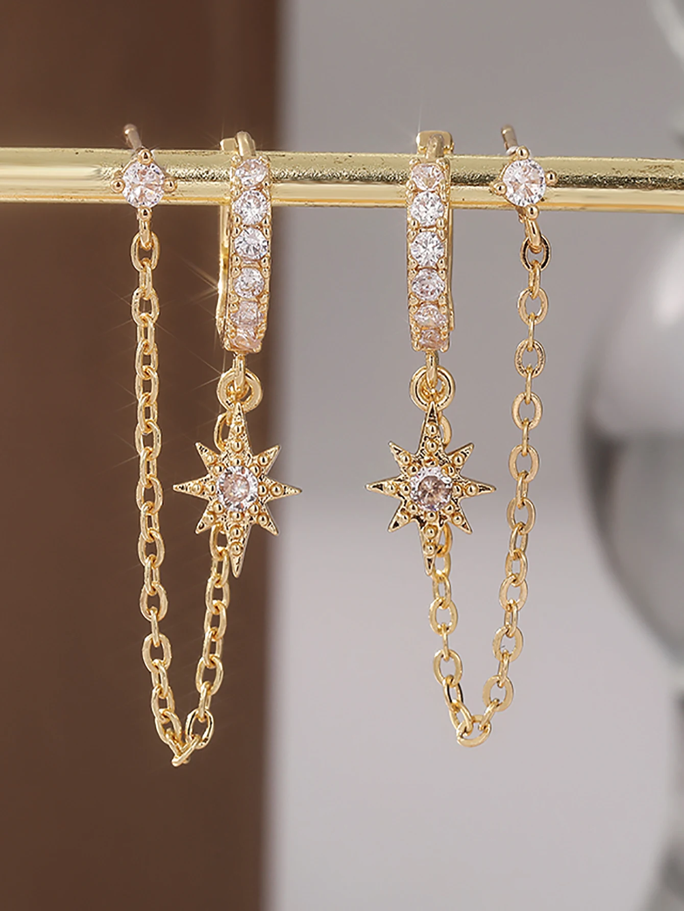 Imagine stepping into your next event with these luxurious gold-tone star designed earrings, effortlessly elevating your style. Crafted from lightweight copper alloy, each piece features dazzling cubic zirconia stones that create a radiant sparkle. The design combines a small, sparkling hoop with delicate dangling chains, ending in a charming star-shaped charm encrusted with tiny stones along its points and center. Perfectly versatile, these earrings suit any occasion, from parties and weddings to casual outings. With a trendy celestial motif, they complement both modern and classic outfits, making you feel confident and glamorous. Whether you’re dressing up or down, these earrings add a touch of sophistication and playfulness to your look, making every moment unforgettable.