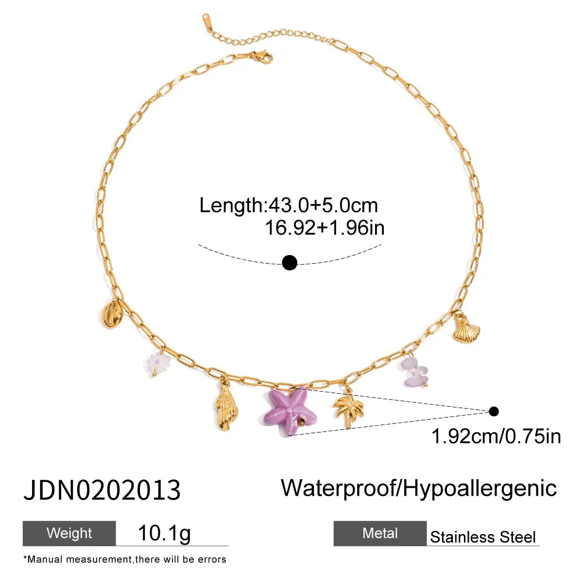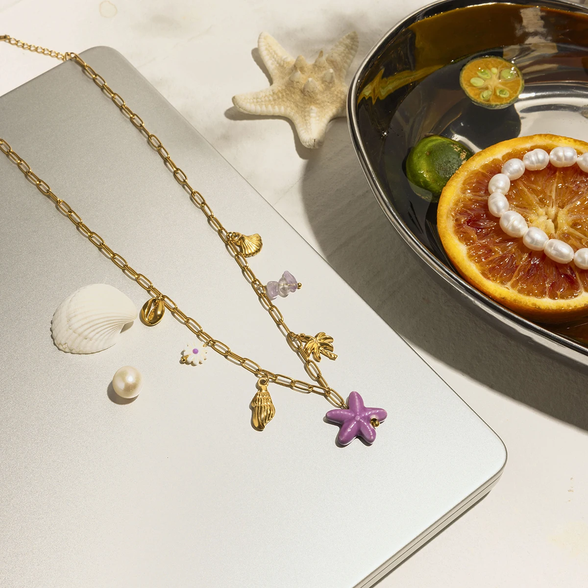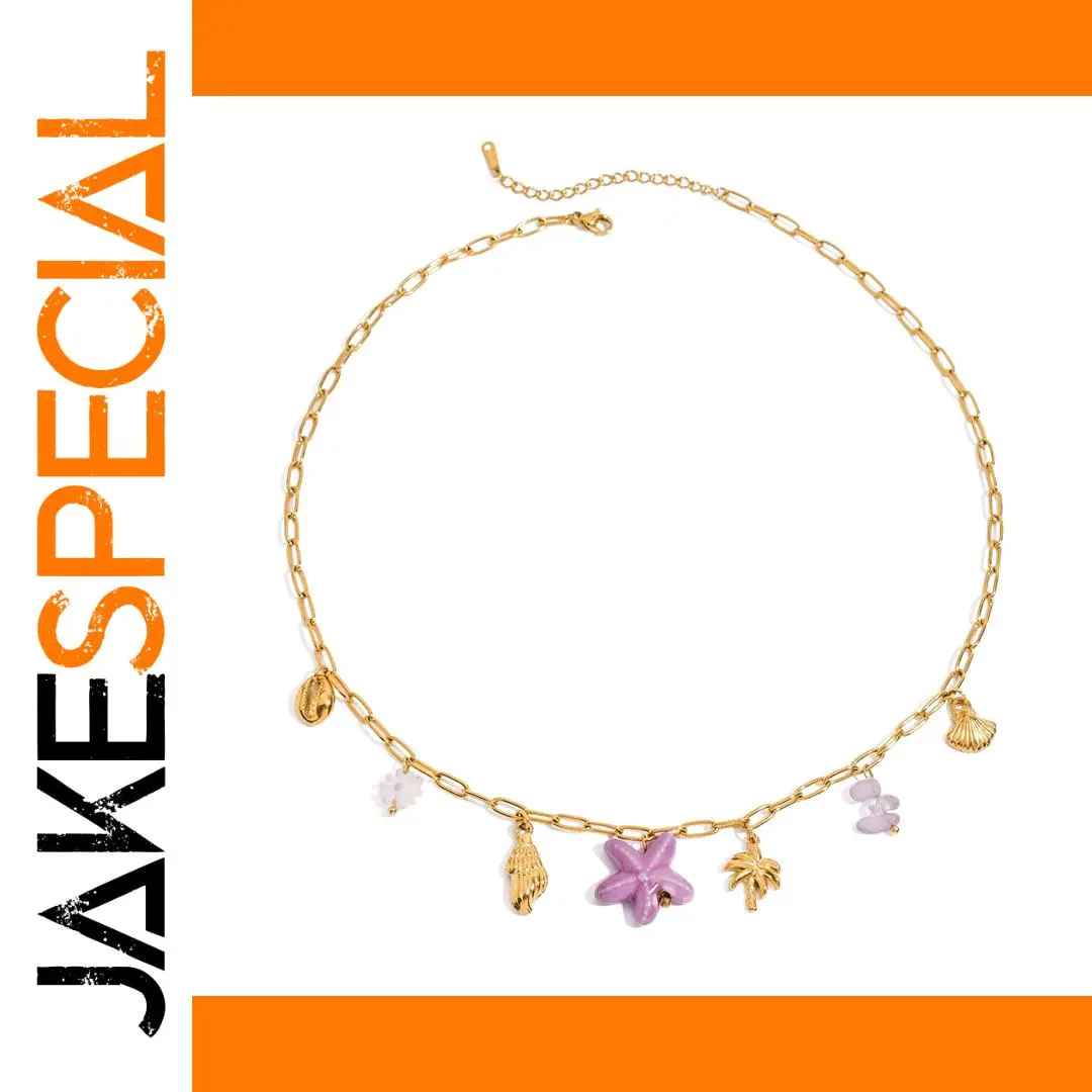 Discover the delightful charm of this this gold-toned coastal charm necklace, crafted from high-quality stainless steel. Its elegant elongated oval-link chain offers a refined yet playful look, perfect for casual summer outings or beach evenings. Adorned with intricately designed tropical-inspired charms, including seashells, a delicate white flower with a yellow center, a detailed seashell, a pink blossom, a tiny palm tree, and clusters of soft light purple beads, this jewelry piece exudes both elegance and fun. The enamel accents add a splash of pastel color, enhancing its eye-catching appeal. Designed for comfort, the necklace is lightweight and features a secure clasp for easy wear. Durable, waterproof, and fade-resistant, it promises long-lasting beauty and seasonless style for any woman seeking a vibrant, nature-inspired accessory.