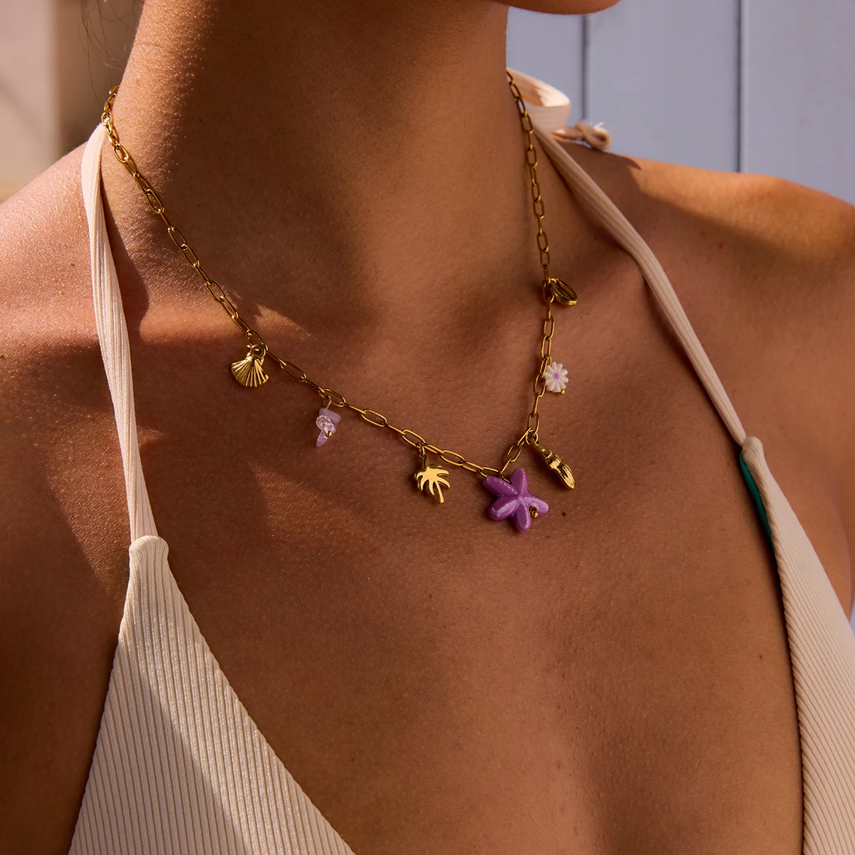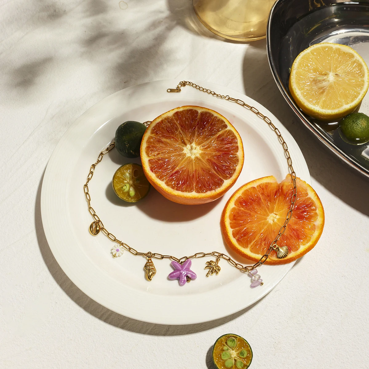 - Decorative charms like shells, enamel flowers, a tiny palm tree, and clusters of light purple beads highlight tropical motifs with soft pastel accents for a playful, stylish touch.