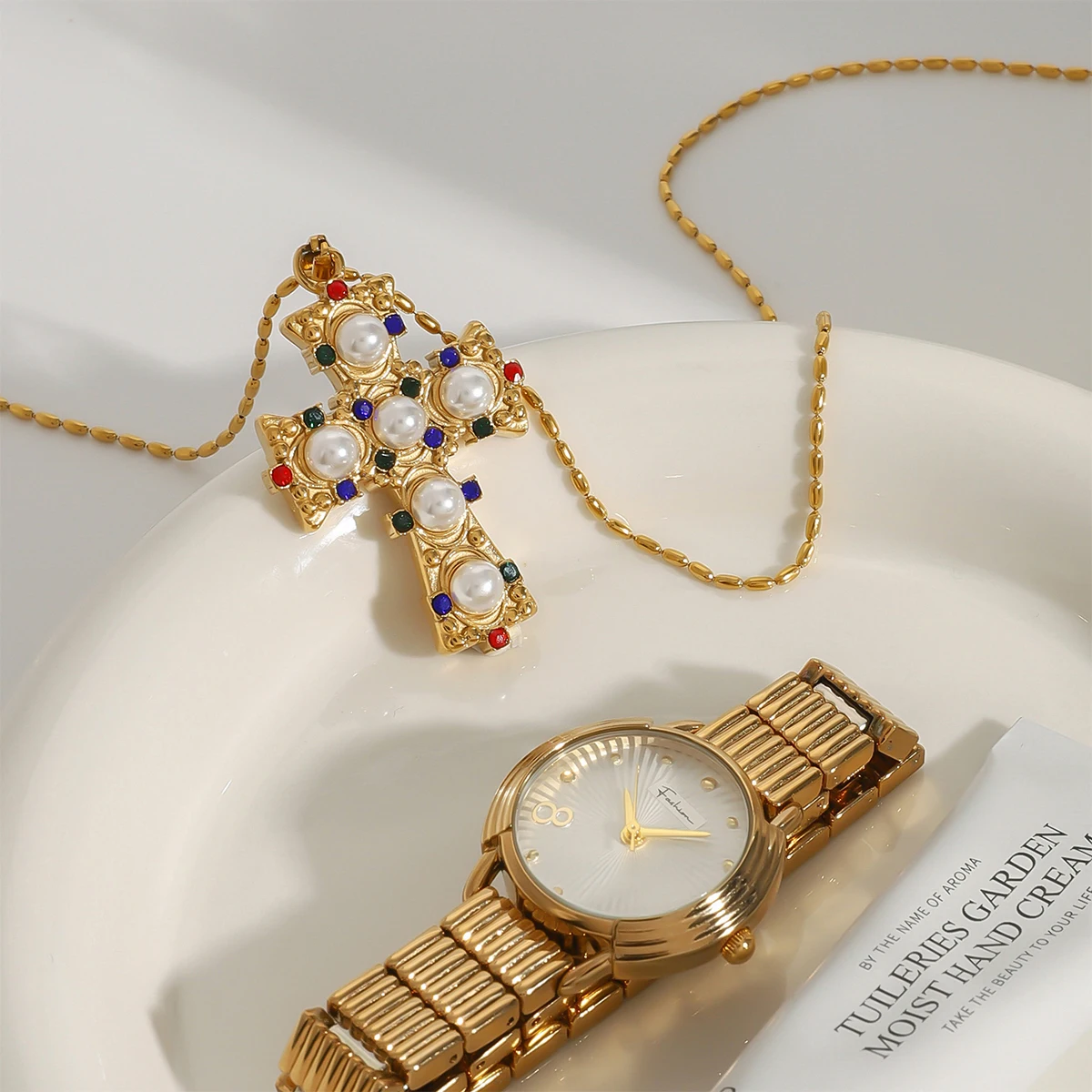 Experience the perfect combination of elegance and vibrant color with this this gold-toned cross necklace. Crafted from durable stainless steel with a high-quality gold finish, it exudes sophistication and longevity. The pendant boasts large, perfectly spaced imitation pearls that add a timeless, refined charm. Surrounding each pearl are tiny, vibrant zircon stones in red, green, and blue, creating lively contrast and visual interest. The textured gold setting features intricate craftsmanship, elevating its luxurious look. Designed for versatility, this waterproof necklace is ideal for daily wear or special occasions. Its matching chain with small oval links ensures a sleek, cohesive aesthetic, making this piece a must-have addition to your jewelry collection.