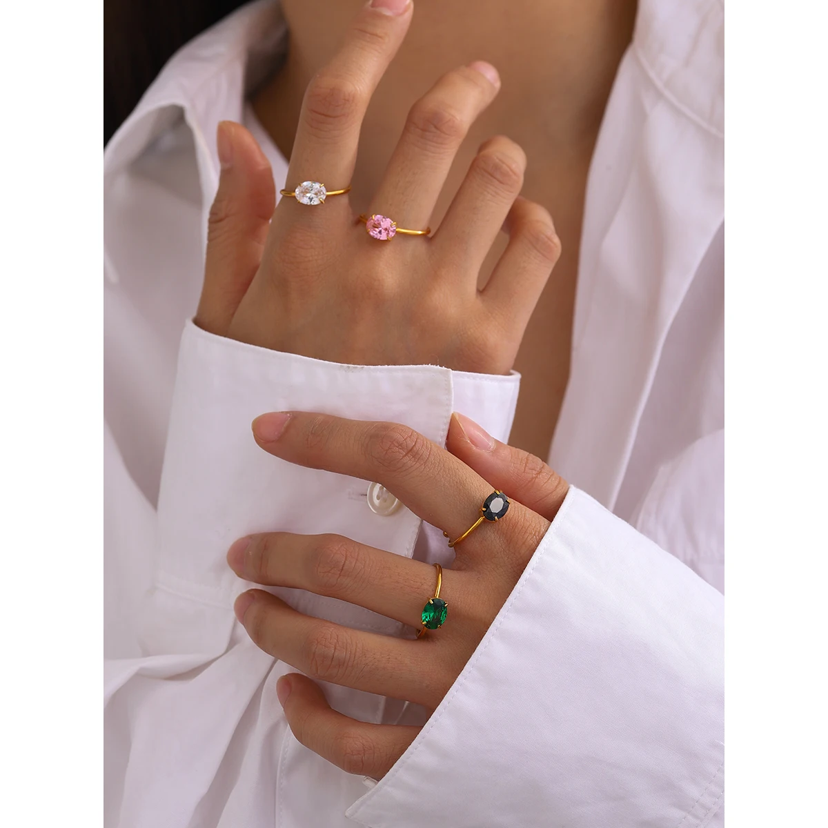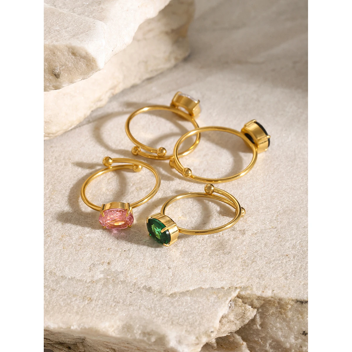 - Specifications include: stainless steel base, gold-tone coating, oval faceted zirconia stones (black, green, pink, white), prong setting, open band with decorative gold accents.