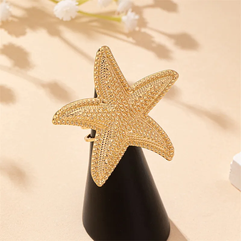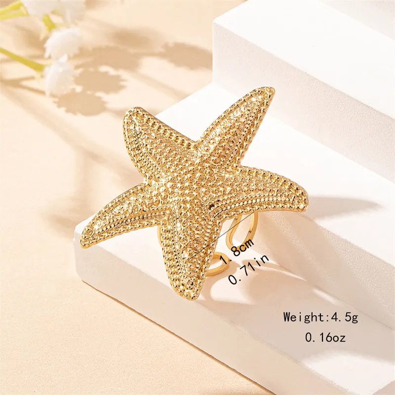 Elevate your style with this vintage-inspired starfish-shaped open ring crafted from zinc alloy, featuring a 2mm wide surface decorated with a lustrous gold finish. Designed for both men and women, this fashion accessory combines playful nautical charm with bold elegance, making it perfect for daily wear or party occasions. Its detailed starfish design, adorned with sparkling accents, adds a touch of glamour and uniqueness to any outfit. The open-ended design allows for easy adjustment, ensuring comfortable fit and versatility. Whether you’re looking to make a statement or add a distinctive touch to your ensemble, this stylish ring is an eye-catching choice that captures attention and expresses personality.
