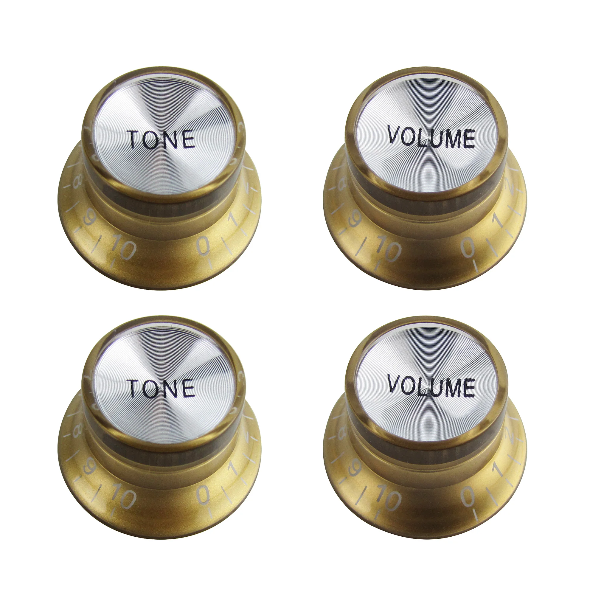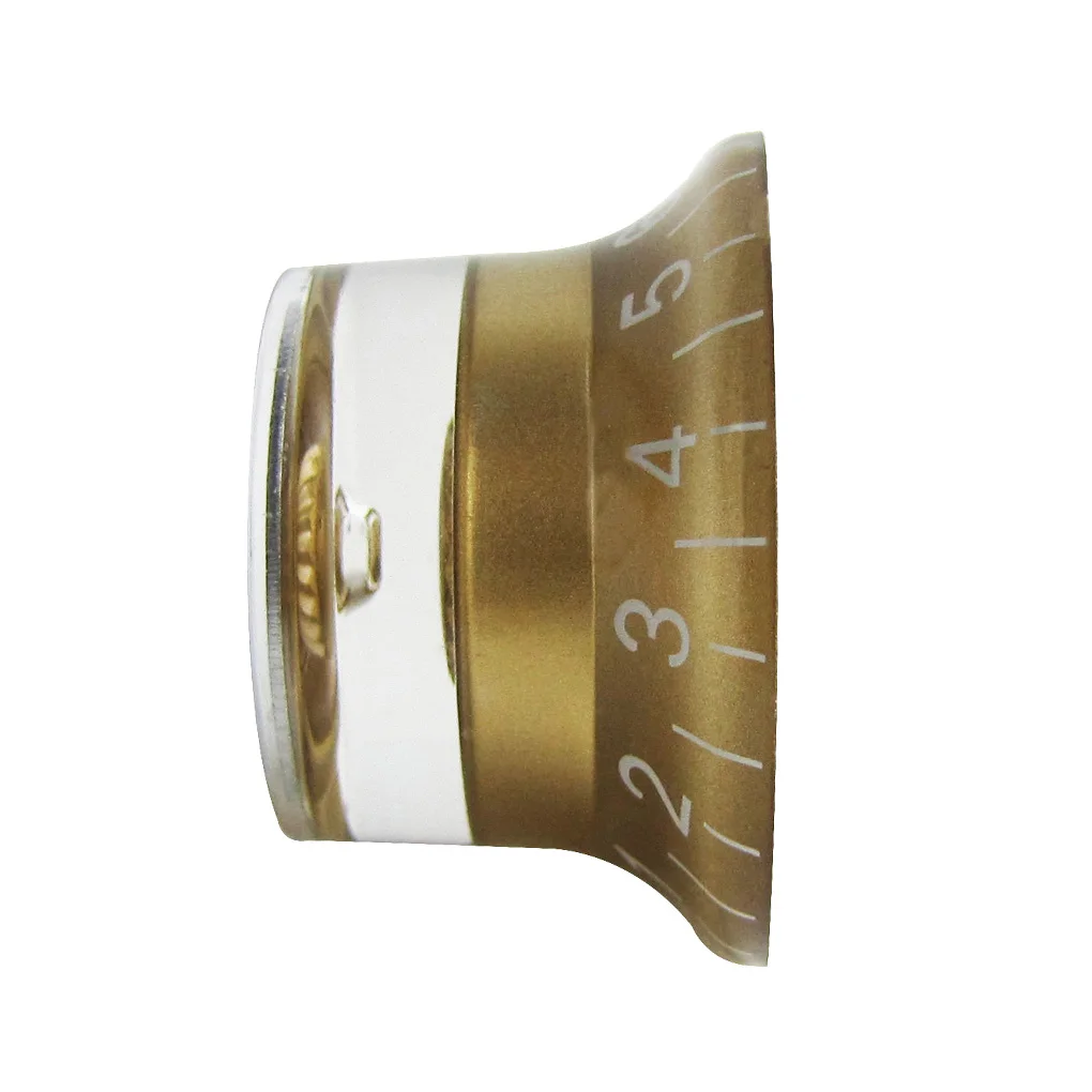 Imagine upgrading your guitar’s control panel with this elegant set of four top hat knobs. The sleek gold finish combined with white numerals offers a sophisticated look that complements LP or SG style guitars perfectly. These knobs, with their polished aluminum tops, reflect light beautifully, adding a touch of class to your instrument. Designed for precision, their tapered shape and clear markings help you easily adjust tone and volume levels during performances or recording sessions. Made from durable plastic and acrylic with a sturdy aluminum top, these knobs are built to last, giving your guitar a refined aesthetic while maintaining functionality. They’re a perfect way to personalize your instrument and improve your playing experience.