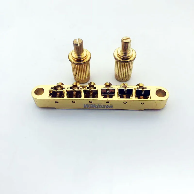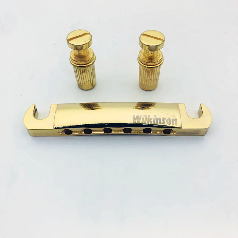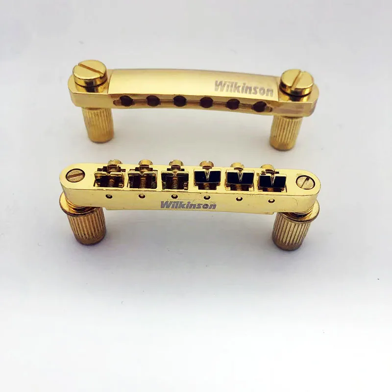 Elevate your guitar’s performance with this premium stainless steel bridge set, compatible with Les Paul and SG electric guitars. Featuring a polished, reflective gold finish, the set includes a sleek tune-a-matic bridge with a curved, elongated design and a go-to style bridge with six black rectangular saddles for precise height adjustment. Weighing approximately 200 grams and crafted with high-quality metal, these components boast smooth, detailed engravings and a robust, machined finish. Designed for easy installation, this set ensures durability, elegance, and optimal sound quality, making it an essential upgrade for professional guitarists seeking both style and functionality.