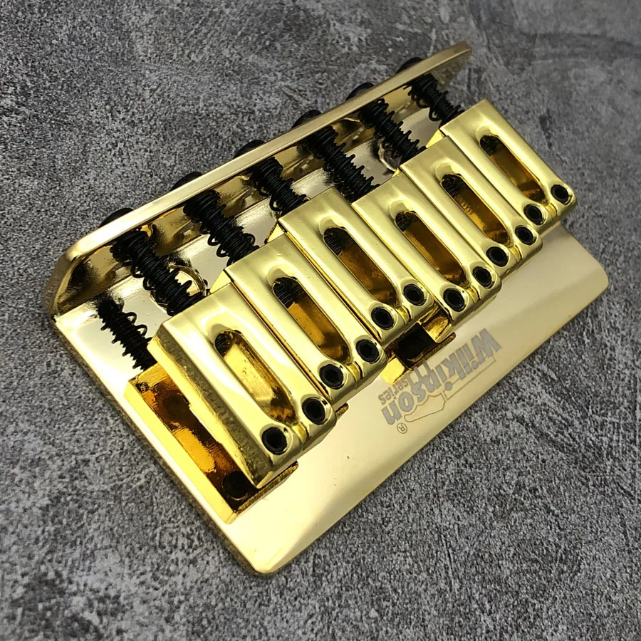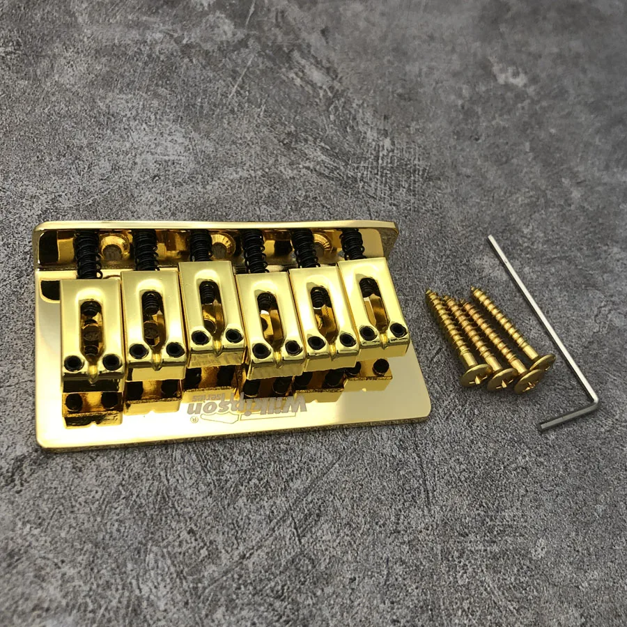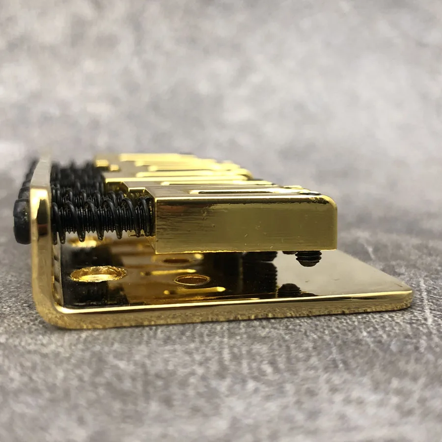 Imagine upgrading your guitar with this stunning Wilkinson Fixed Bridge WOF01 GD, and instantly elevating its visual appeal and performance. Crafted from high-quality metal, this bridge boasts a sleek, highly polished gold finish that is both reflective and luxurious. Its smooth surface, complemented by rounded edges, exudes an elegant and premium vibe. Designed with multiple individual saddles featuring curved shapes, black screws, and springs, it offers precise string height and intonation adjustments. Whether you're aiming for tonal excellence or aesthetic refinement, this meticulously crafted bridge provides stability and style in one package. Its durable construction and eye-catching metallic shine make it a perfect addition for guitar enthusiasts seeking a combination of function and sophisticated modern design.