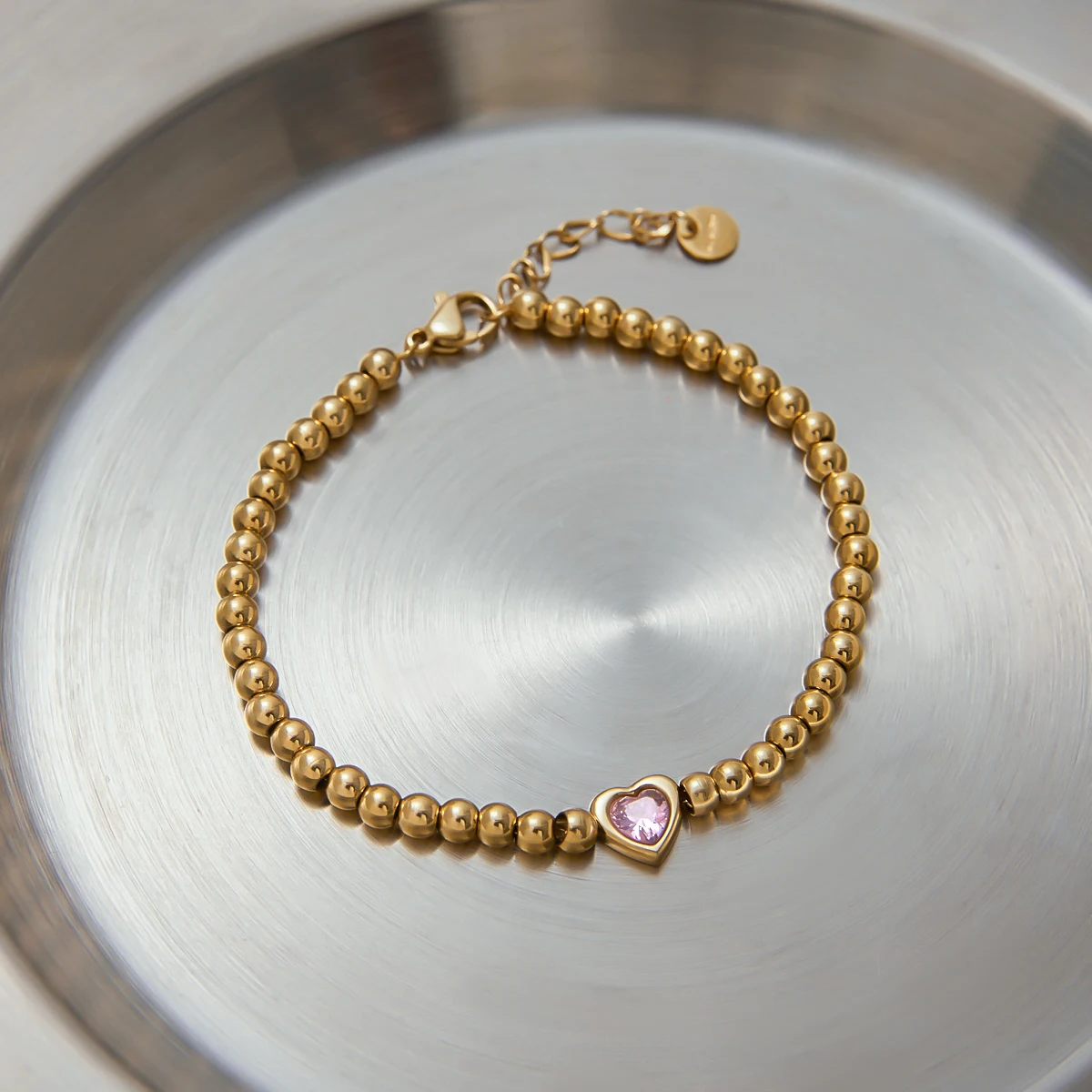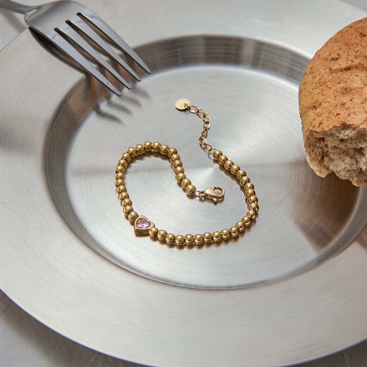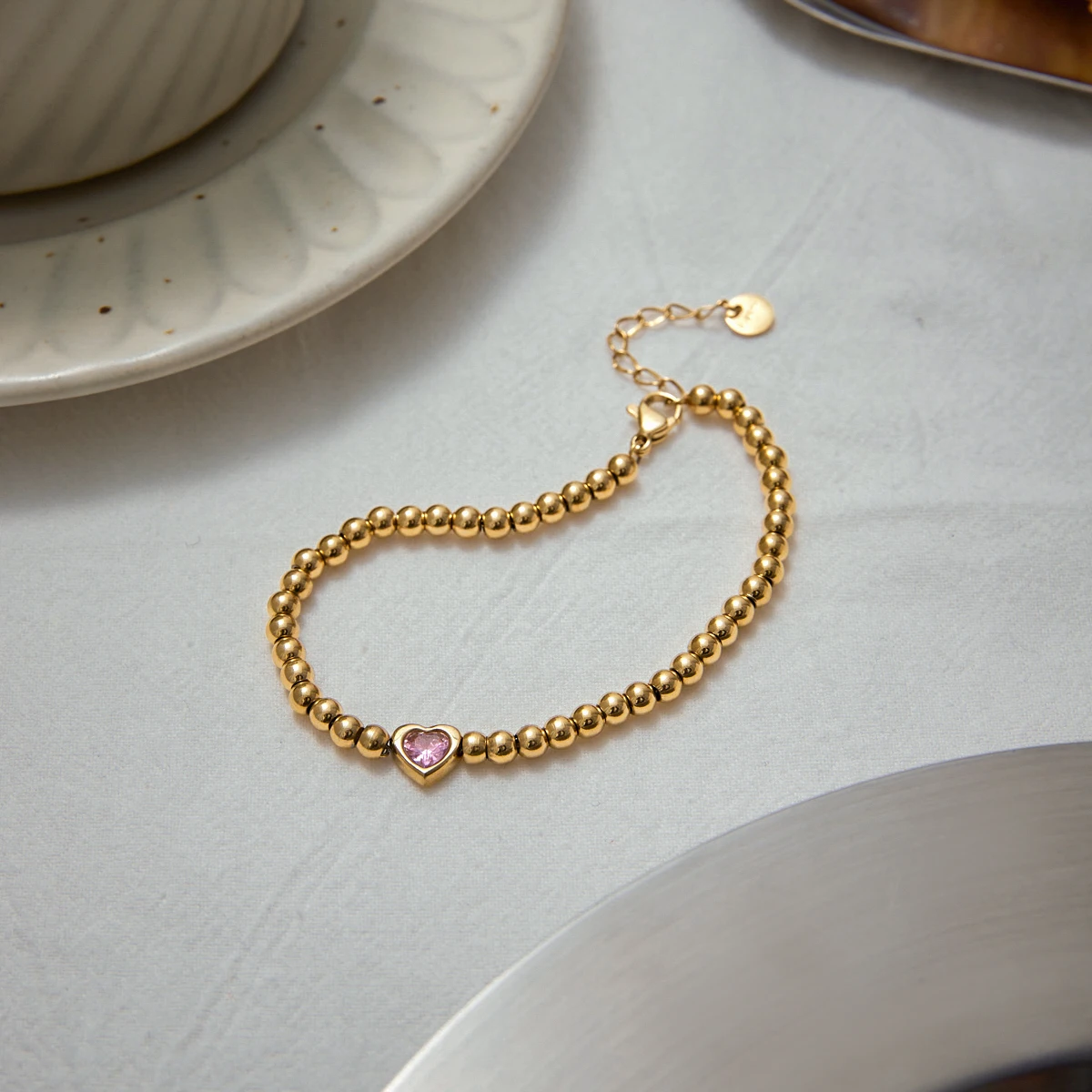 - Central feature is a heart-shaped zirconia bead with a light pink, faceted stone that captures and reflects light, creating a sparkling effect that adds a romantic, feminine touch to any outfit.