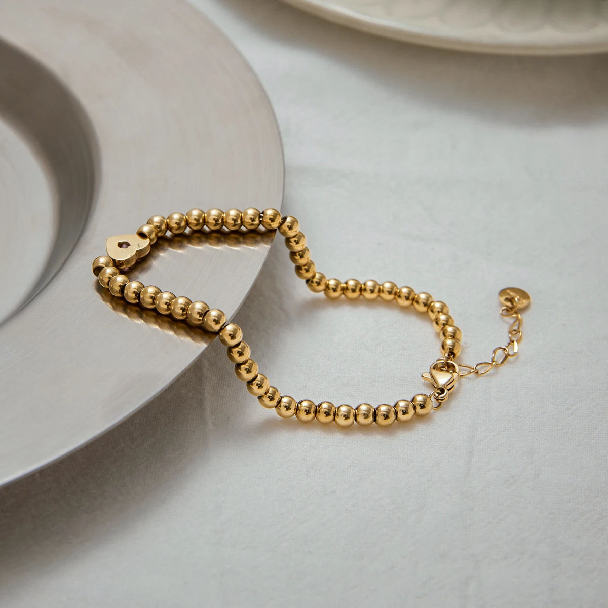 Experience effortless style and sophistication with this stunning gold women's bracelet. Crafted from durable, tarnish-free stainless steel, it boasts a shiny, polished finish that captures light beautifully. The centerpiece features a delicate heart-shaped zirconia bead with a light pink, faceted stone that radiates subtle glamour. Its minimalist yet romantic design makes it perfect for daily elegance or special moments. The bracelet includes an adjustable chain extender with a charming small gold-colored charm, ensuring a comfortable, personalized fit for any wrist size. Whether you're gifting yourself or someone special, this piece aligns with your refined taste and desire for long-lasting beauty. Its waterproof, scratch-resistant qualities promise enduring shine and resilience.