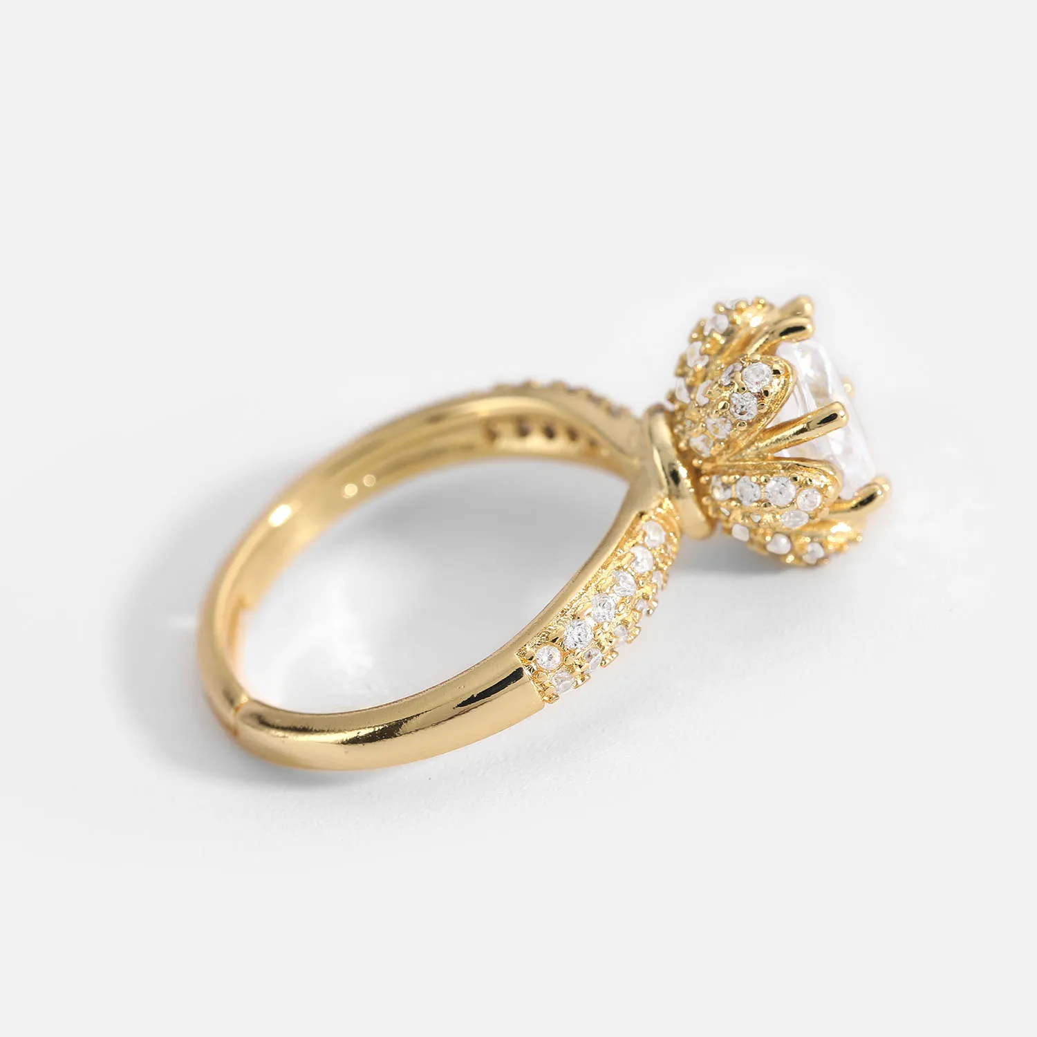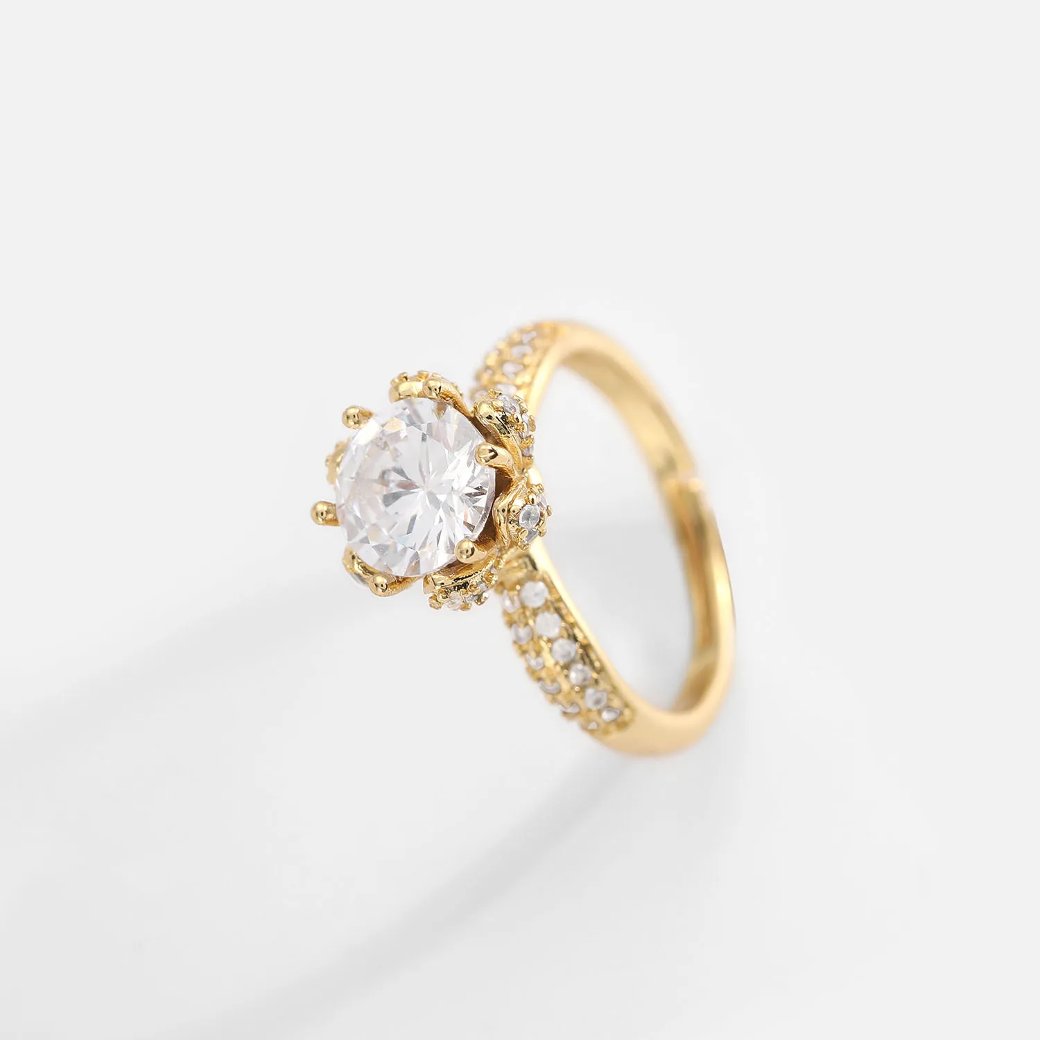 Elevate your style with this elegant women’s ring featuring a sleek copper base with a tarnish-resistant gold finish. The center boasts a large, round cubic zirconia (color code JDR201699) set in a modern geometric tension mount, creating a striking focal point. The band is adorned with multiple small pavé-set CZ stones that add extra brilliance from every angle. Its adjustable size ensures a comfortable and perfect fit for different finger sizes. Perfect for both formal occasions and everyday wear, this contemporary piece combines durability, luxury, and timeless elegance, making it a versatile addition to your jewelry collection.