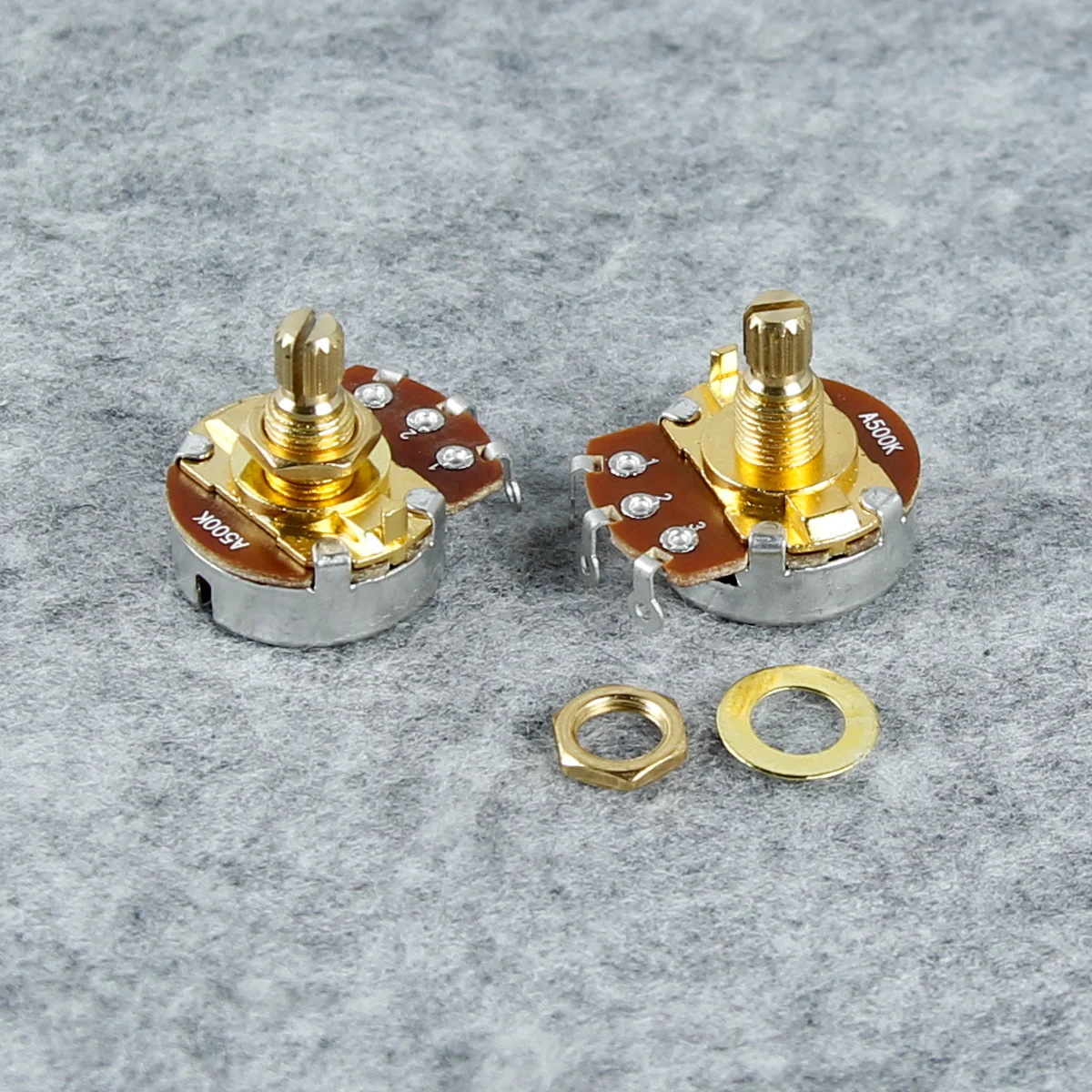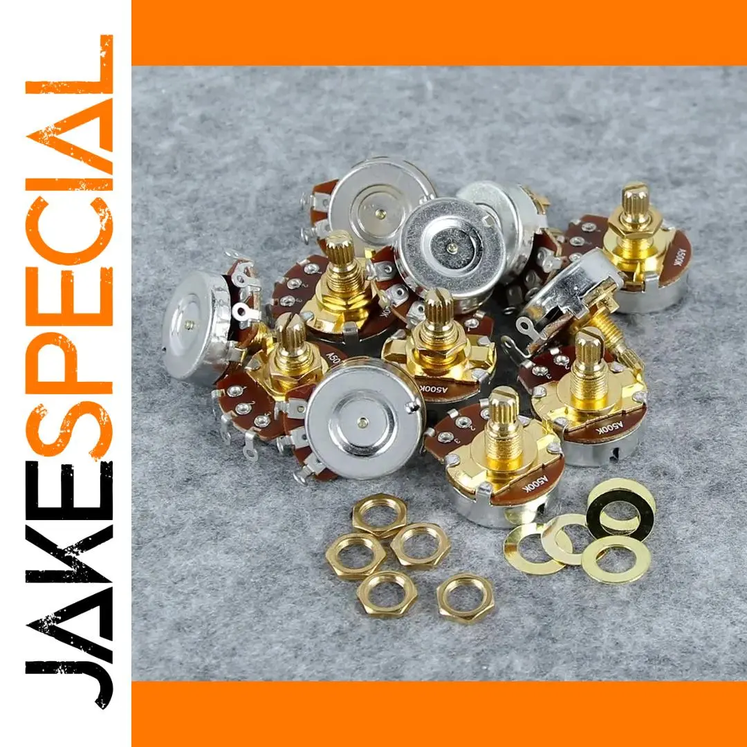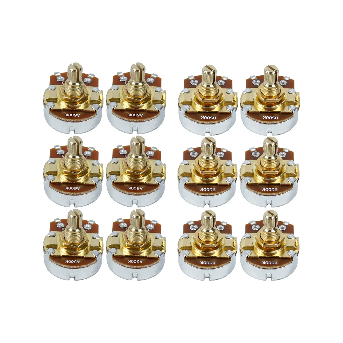Enhance your electric guitar or bass with this set of 12 high-quality metal potentiometers featuring a sleek silver finish and short 15mm shafts. Available in four models—A250K, B250K, A500K, and B500K—these potentiometers are designed for precise tone and volume control. The A models provide logarithmic (audio) taper for musical richness, while the B models offer linear taper for consistent volume adjustments. Each unit includes a brass split shaft compatible with 18-spline knobs, along with a flat washer and hex nut for easy height adjustment. Suitable for a variety of pickup types, these durable potentiometers are perfect for custom guitar projects requiring reliable components.