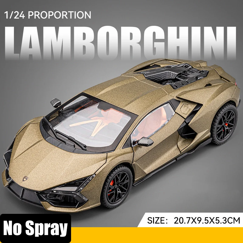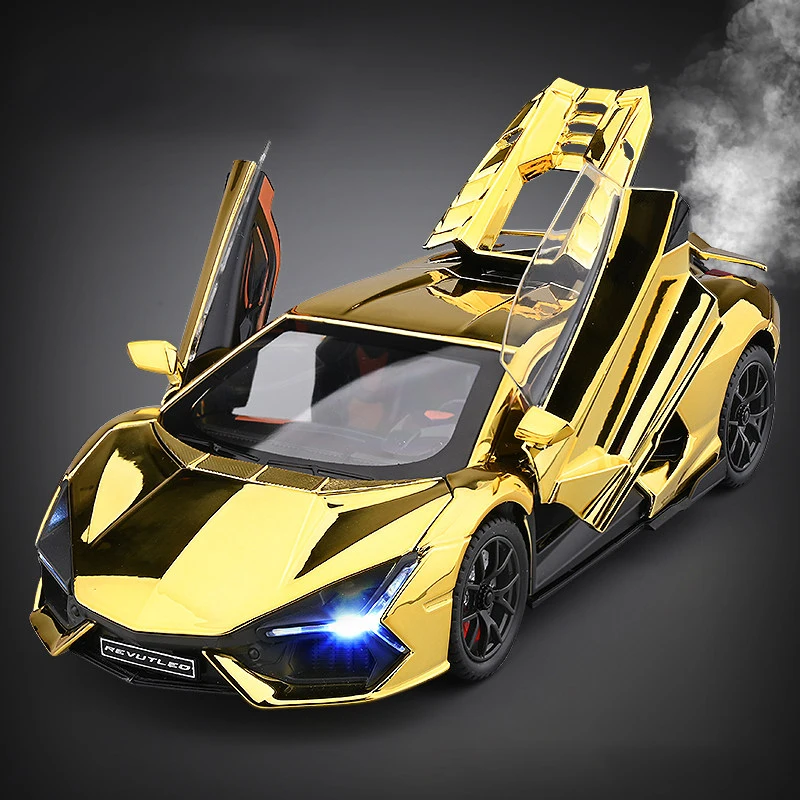 Imagine owning a piece of automotive art that instantly elevates your collection. This detailed 1:24 scale diecast model of the Lamborghini Revuelto Countach LP500S captures the sleek, aggressive aesthetic of the original supercar. Finished in a luxurious metallic gold, it boasts a glossy, reflective surface that highlights its sharply sculpted lines and aerodynamic profile. The model’s narrow headlights emit a vibrant blue, contrasting sharply with the gold body, while black accents along the sides and windows emphasize its sporty stance. With gull-wing doors opening upwards, revealing the detailed interior, and realistic rubber tires with red brake calipers, this model brings high-performance design to your desktop or display shelf. It offers both elegance and excitement in a precision-crafted collectible.