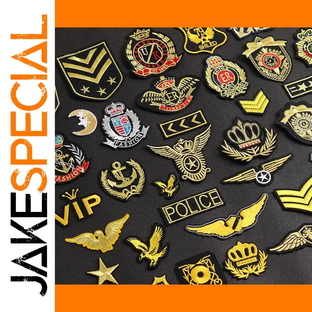 Transform your wardrobe and accessories with this stunning collection of Golden Letters Icon embroidery patches. Crafted from non-woven fabric, these patches are both durable and eco-friendly. With intricately designed motifs including military insignias, crowns, wings, and whimsical elements like a crescent moon, each patch adds a unique flair to your clothes or bags. The handmade, 3D features enhance their tactile appeal, making these patches perfect for personalizing t-shirts, tops, pants, coats, and curtains. Visualize your favorite items embellished with these distinct and stylish patches, elevating your individual aesthetic with ease.