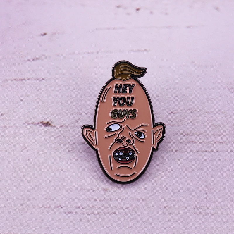Bring a touch of 80s nostalgia to your collection with this vibrant enamel pin inspired by the classic Goonies movie. Crafted from high-quality copper, this whimsical pin measures approximately 30 mm in height, making it the perfect size to showcase your love for vintage films. The design features a lively cartoon caricature with exaggerated facial features, including wide and squinted eyes, arched eyebrows, and a mischievous, crooked-toothed grin. The face is highlighted with detailed black outlines and a light skin tone background, framed by a stylized tuft of dark hair swooping to one side. Bold black text reading “HEY YOU GUYS” curves above, amplifying its comic appeal. Its charming, colorful style makes it ideal for everyday wear or as a special collector’s piece.