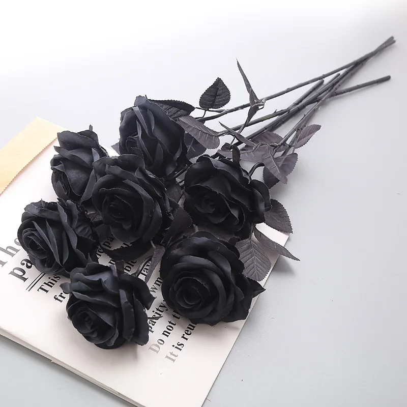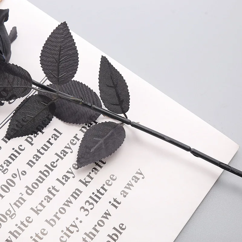 - This artificial black rose is made from non-woven fabric, offering durability and safety, designed for indoor use across various special occasions like Halloween, weddings, and parties.