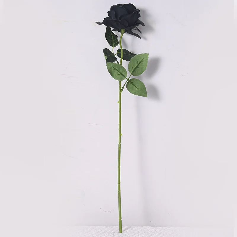 Immerse yourself in the dark elegance of this artificial black rose, crafted to evoke a gothic, spooky vibe perfect for Halloween or horror-themed decor. With its layered, curled petals made from smooth, matte-finished fabric, it captures a realistic yet hauntingly beautiful appearance. The slender, glossy black stem features elongated textured leaves with detailed veins and serrated edges, enhancing its naturalistic aesthetic. Measuring approximately 20-30 centimeters, this single rose brings a mysterious charm to any indoor space, whether used in a bouquet, as a standalone accent, or incorporated into themed decorations. Its dark monochromatic color amplifies its gothic allure, making it an ideal choice for creating a spooky or elegant atmosphere in your home or event setting.