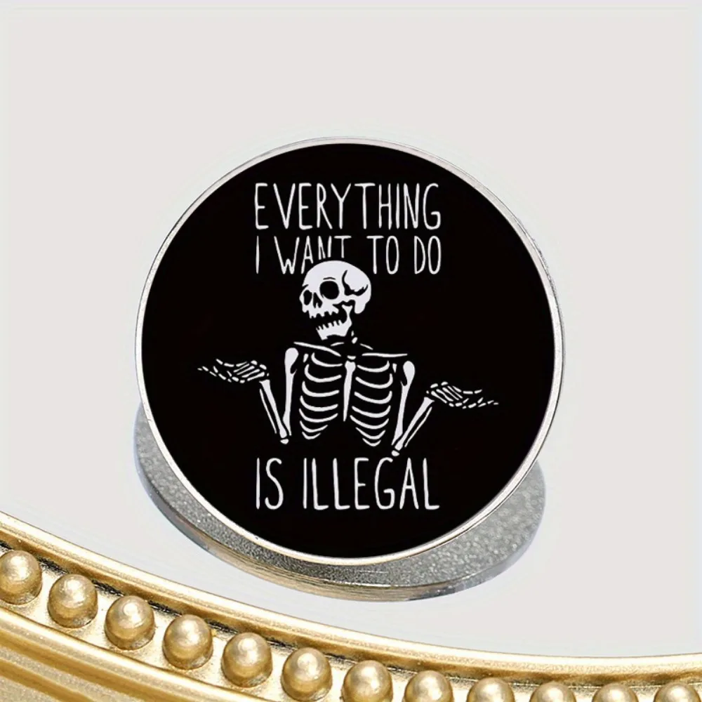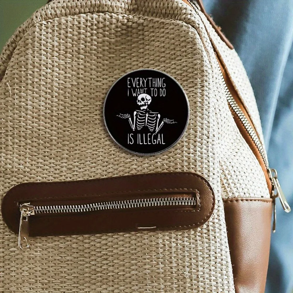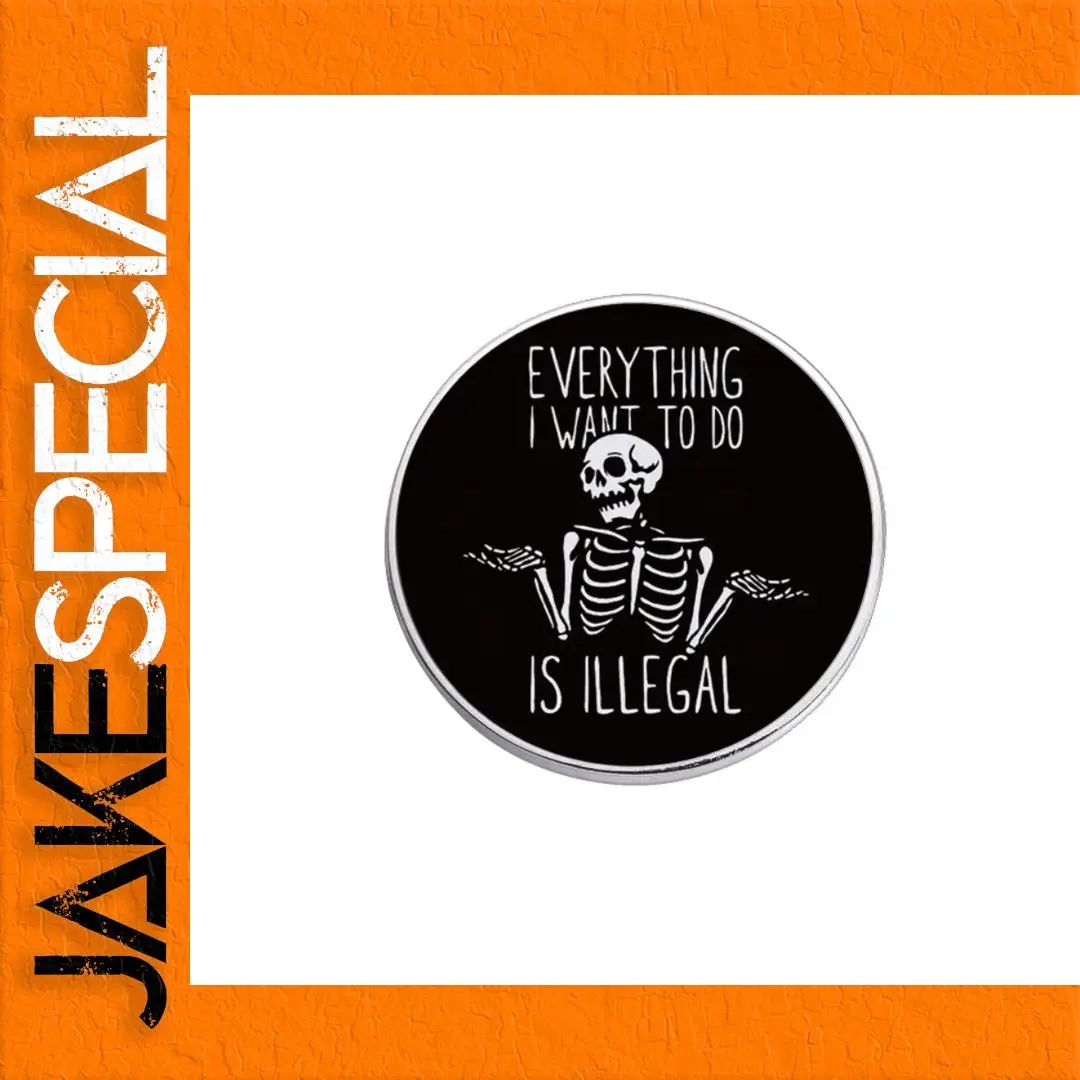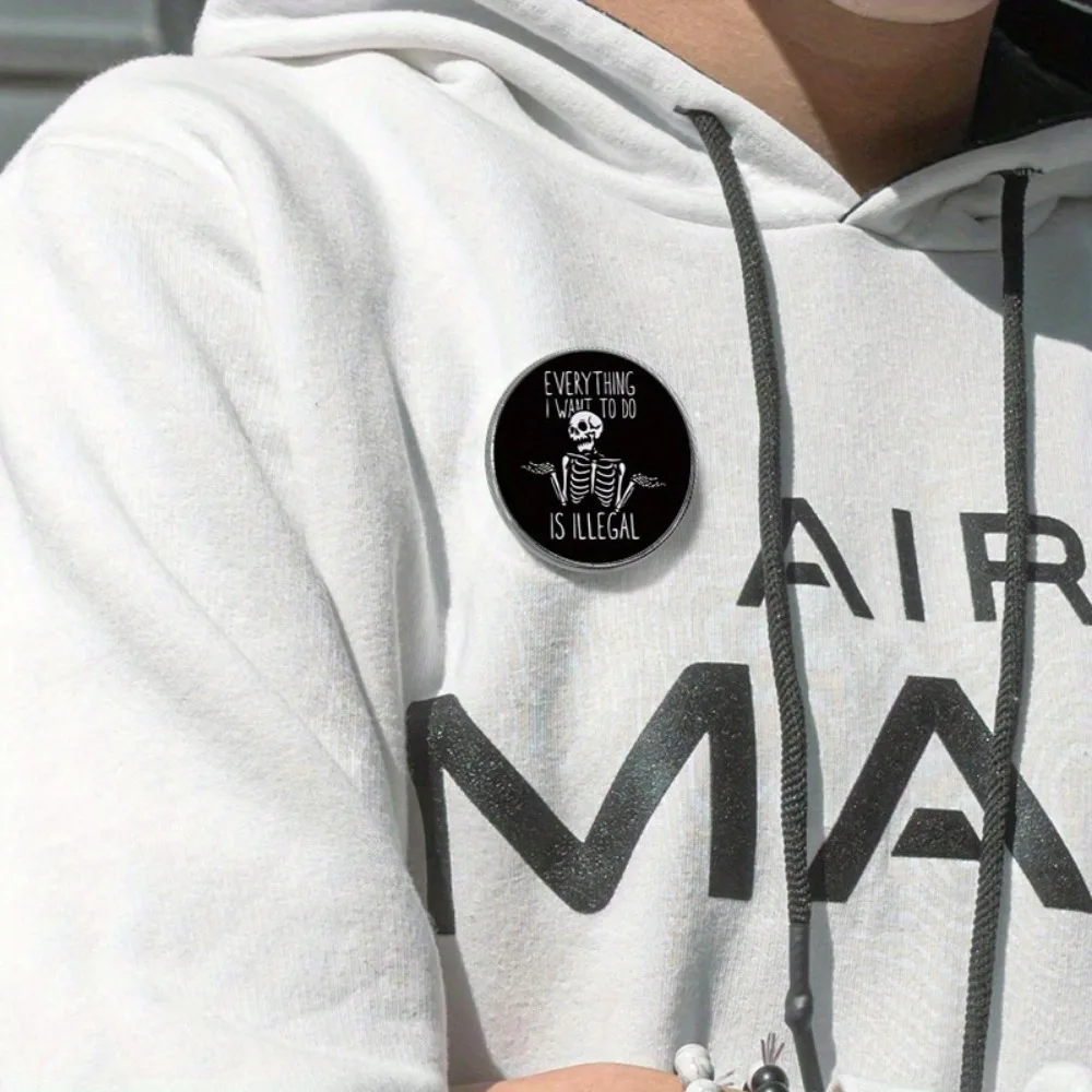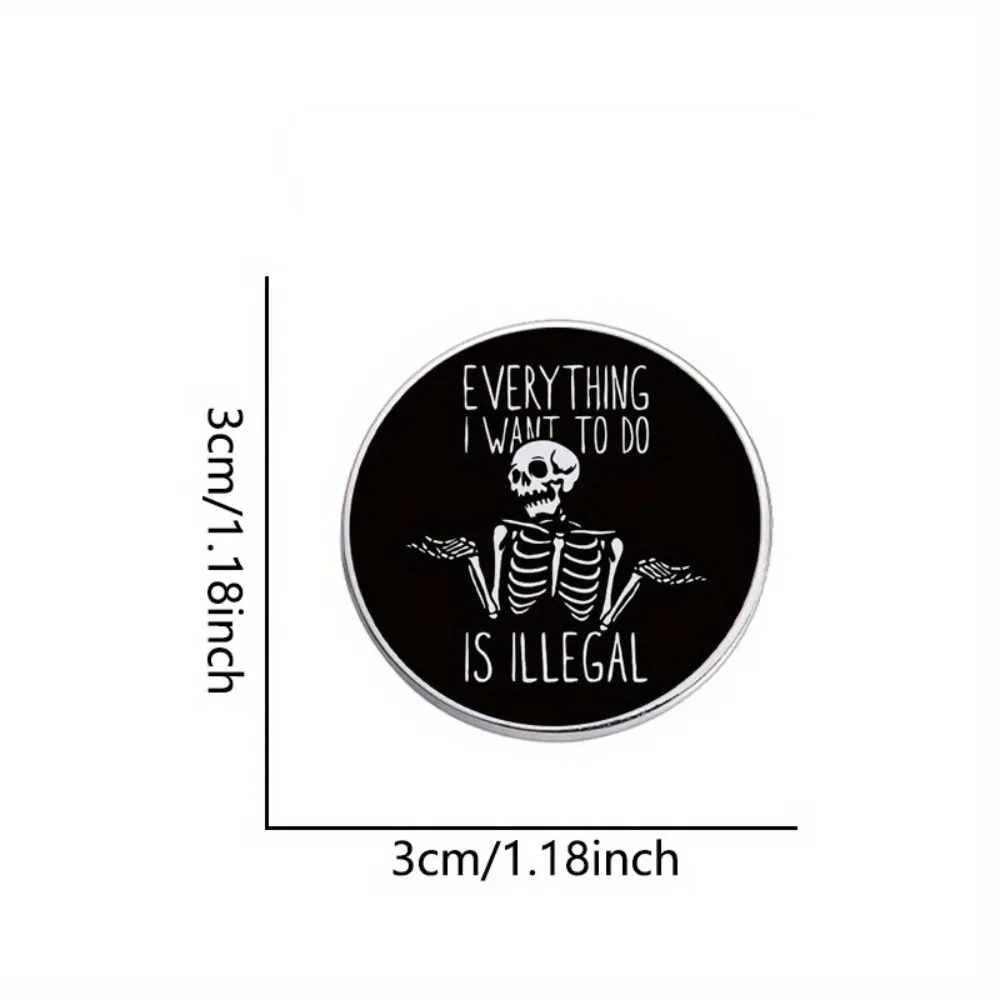 This Gothic Skull Badge Brooch Pin stands out with its striking design, featuring a glossy black background adorned with an exaggerated skeleton graphic and provocative text reading, “EVERYTHING I WANT TO DO IS ILLEGAL.” The playful posture of the skeleton adds a rebellious flair, perfect for a variety of occasions, including parties, casual outings, or cosplay events. Measuring 3cm by 3cm and weighing just 10 grams, this pin is lightweight and easy to attach to bags, jackets, or other accessories. The metallic outer rim enhances durability, making it a trendy accessory for any fashion statement.