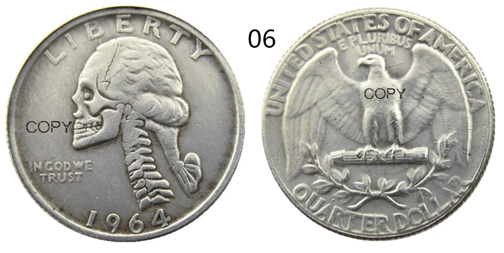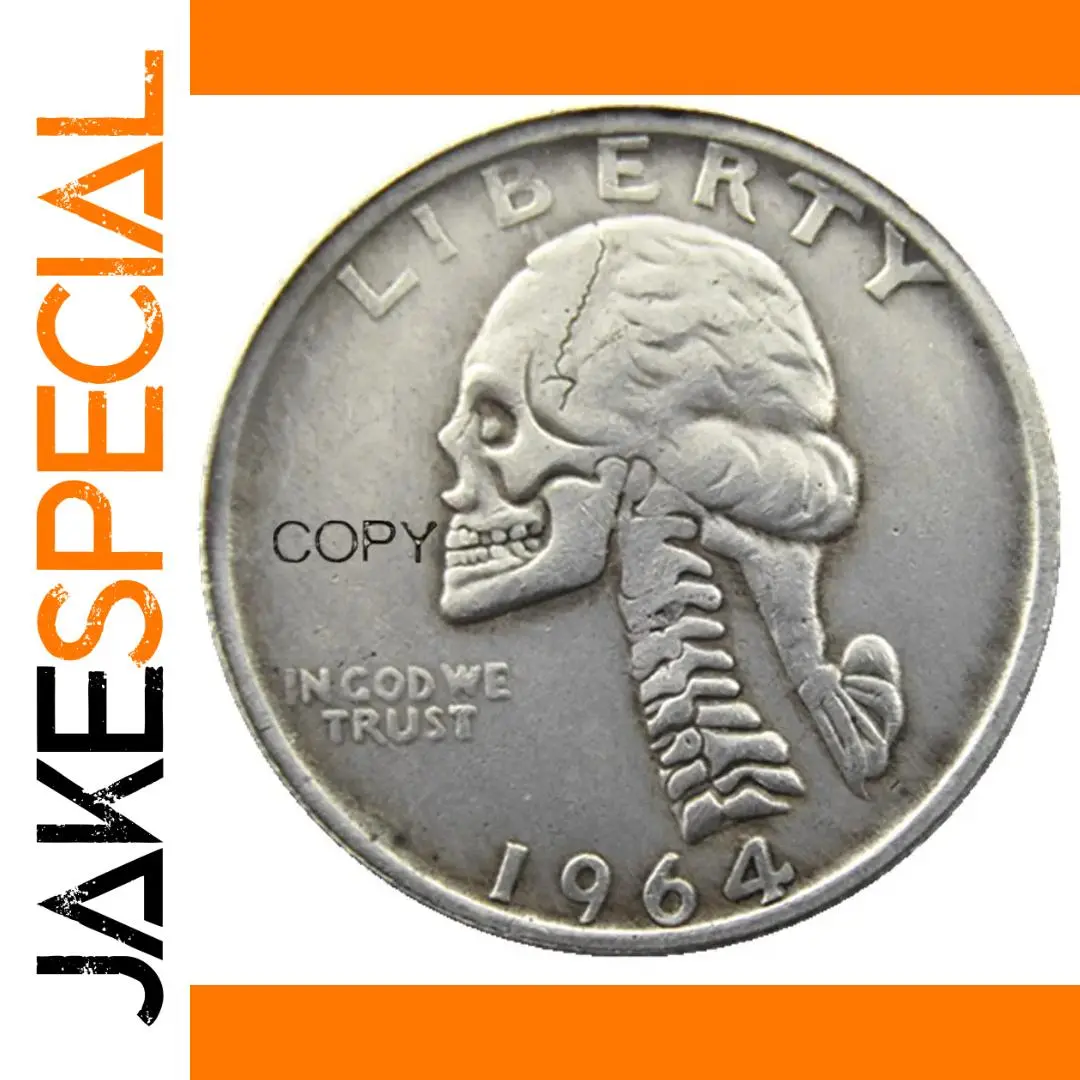 Immerse yourself in the dark beauty of this collectible coin inspired by the classic Washington Quarter, dating from 1900-1919. Crafted with traditional techniques, it features a highly detailed raised design of a human skull in profile, facing left. The skull seamlessly transitions into a meticulously carved skeleton hand, adding an artistic, macabre touch that evokes Gothic aesthetics. The coin's surface has a natural metallic finish, either silvery or resembling silver, with a slightly matte texture that accentuates the intricate details. Inscribed with “LIBERTY” along the rim, “COPY” on the left, and “IN GOD WE TRUST” below the skull, it combines patriotic themes with dark, historical artistry. Its regional American features evoke nostalgia and gothic elegance, making it a unique collector’s piece.